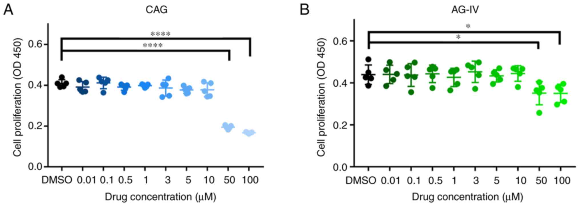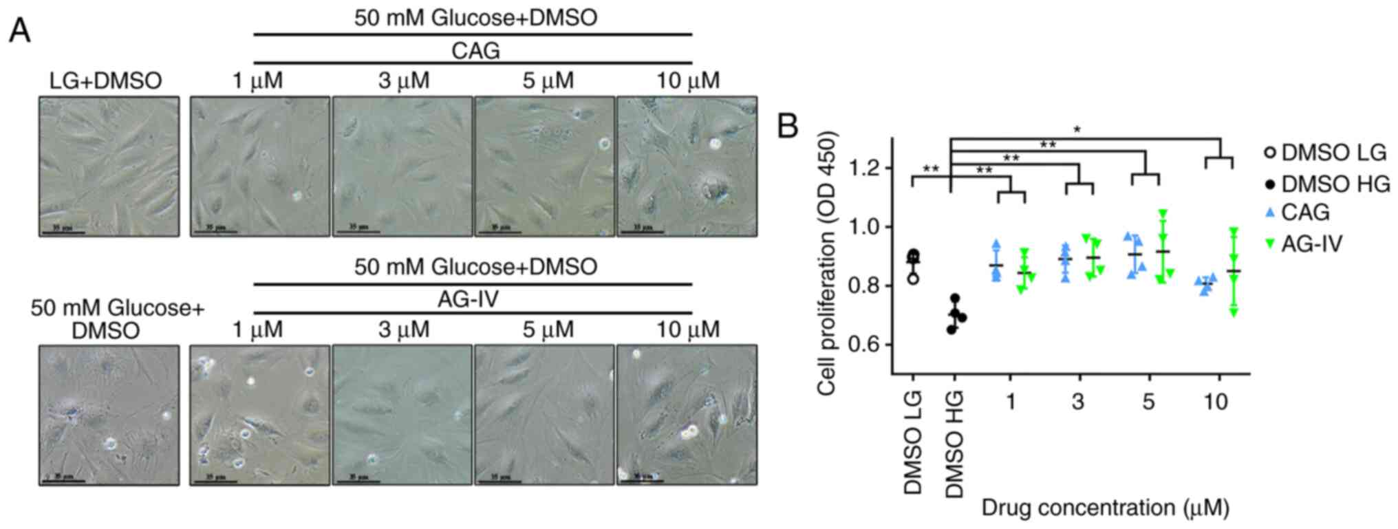 CAG and AG-IV were dissolved in dimethyl sulfoxide (DMSO) at concentrations of 500 mM, and then appropriately diluted with complete culture medium (final DMSO concentration <1%). All the relevant groups were pretreated with different drug concentrations (1, 3, 5 and 10 mM) and then with HG (50 mM). All the experiments were performed in triplicate.