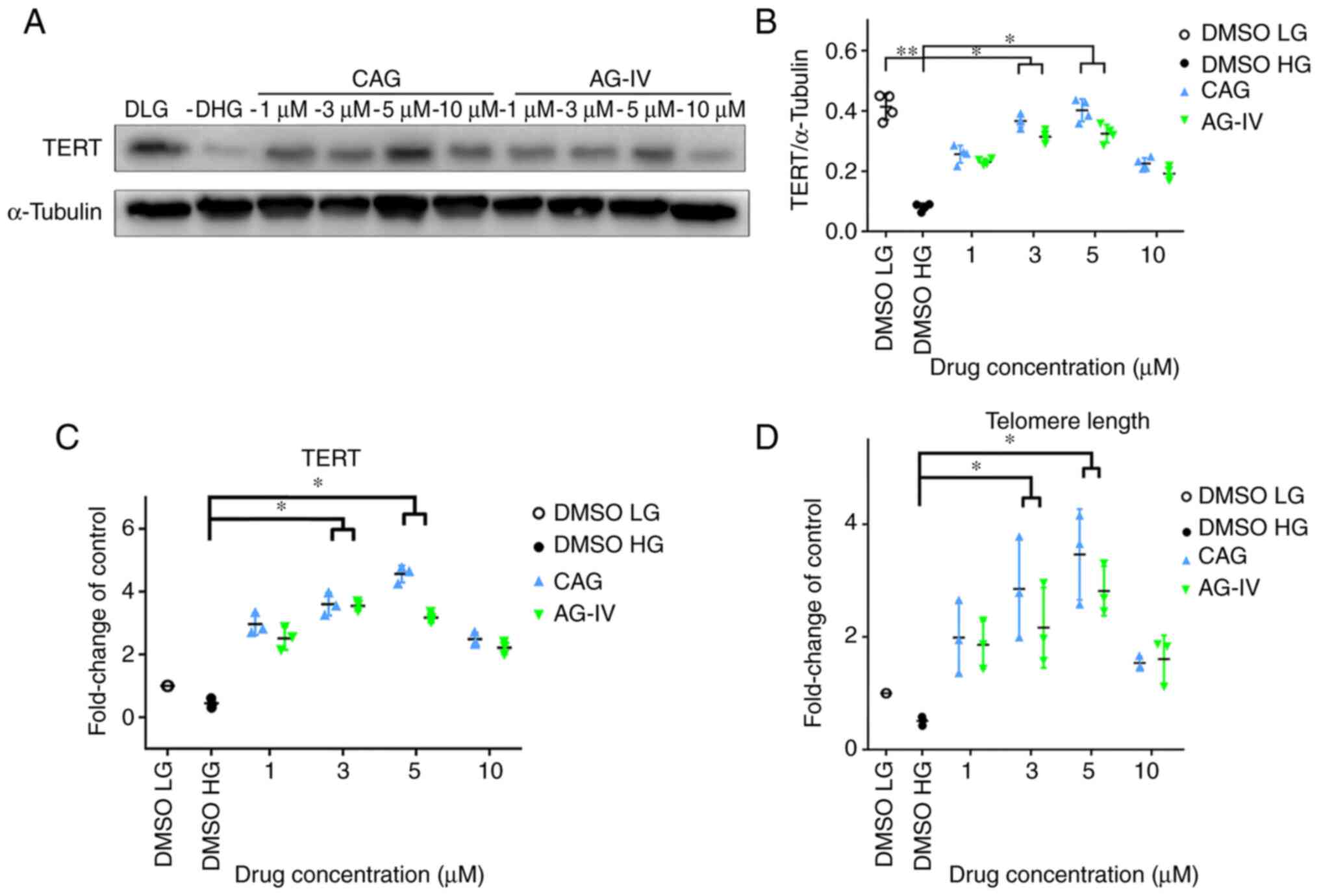 NPs were pretreated with CAG or AG-IV at 1, 3, 5 and 10 mM concentrations for 24 h, serum-starved for 24 h and then treated with a HG concentration of 50 mM for 72 h. In Fig. 6A and B, western blotting demonstrated that TERT protein expression levels were significantly decreased in HG-only conditions compared with the LG group, but the expression recovered in CAG and AG-IV drug treatment groups (P<0.05).