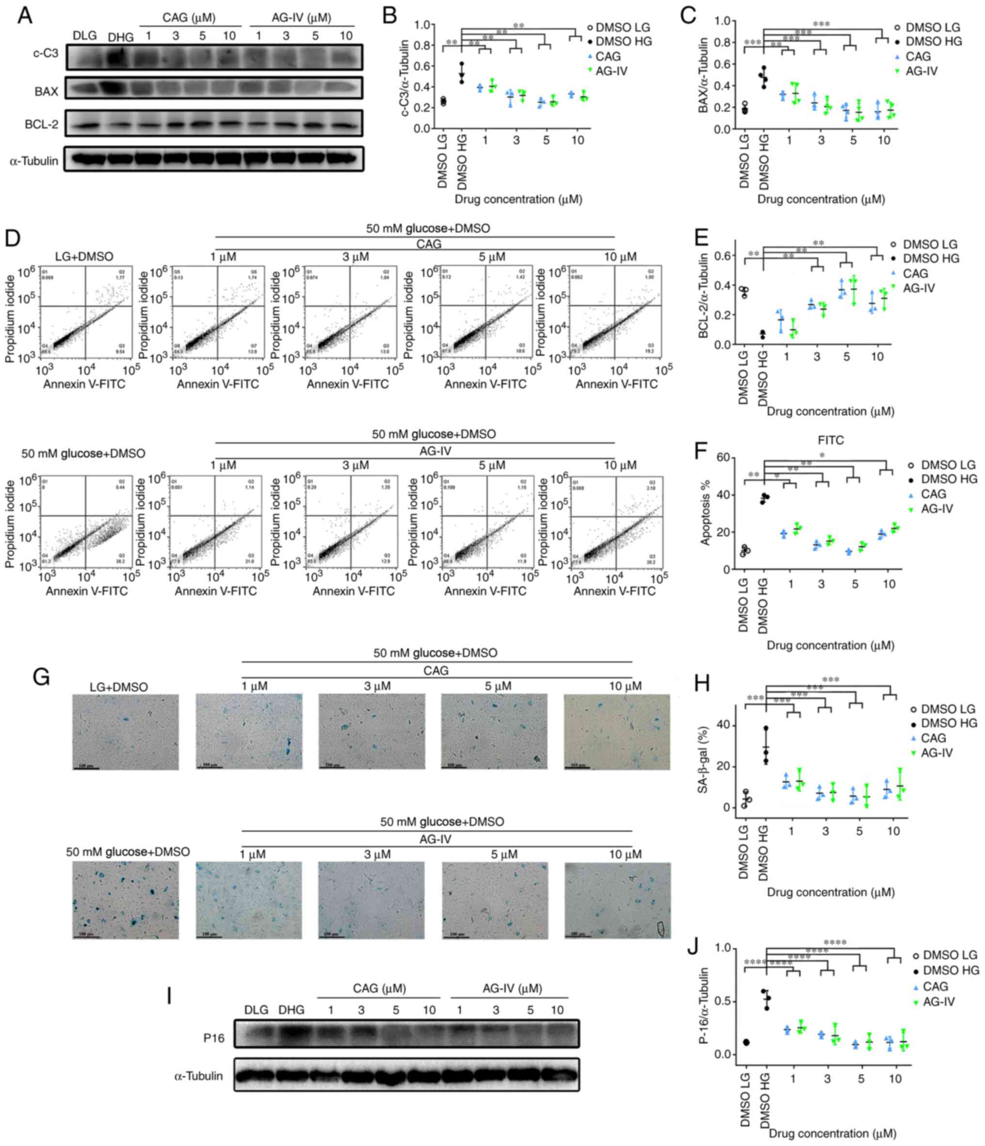 Meanwhile, as presented in Fig. 7D and F, the percentage of FITC (apoptosis marker) as detected by Annexin-V was significantly increased in HG conditions compared with the LG group, while the percentage decreased in drug-treated groups compared with the HG group (P<0.05). Moreover, the β-Gal staining in Fig. 7G and H shows a significantly higher percentage of stain-positive cells in the HG group compared with the LG group; whereas, the percentage of stain-positive cells significantly decreased in the drug treated groups (P<0.0001). Finally, as presented in Fig. 7I and J, the expression levels of p-16 protein were significantly increased in the HG only group compared with the LG condition group; whereas, the expression levels decreased in the drug-treated groups compared with the HG group (P<0.0001). These result demonstrated that CAG and AG-IV attenuated the cellular apoptosis and senescence of NPCs treated with HG, and this was most notable at concentrations of 3 or 5 mM.