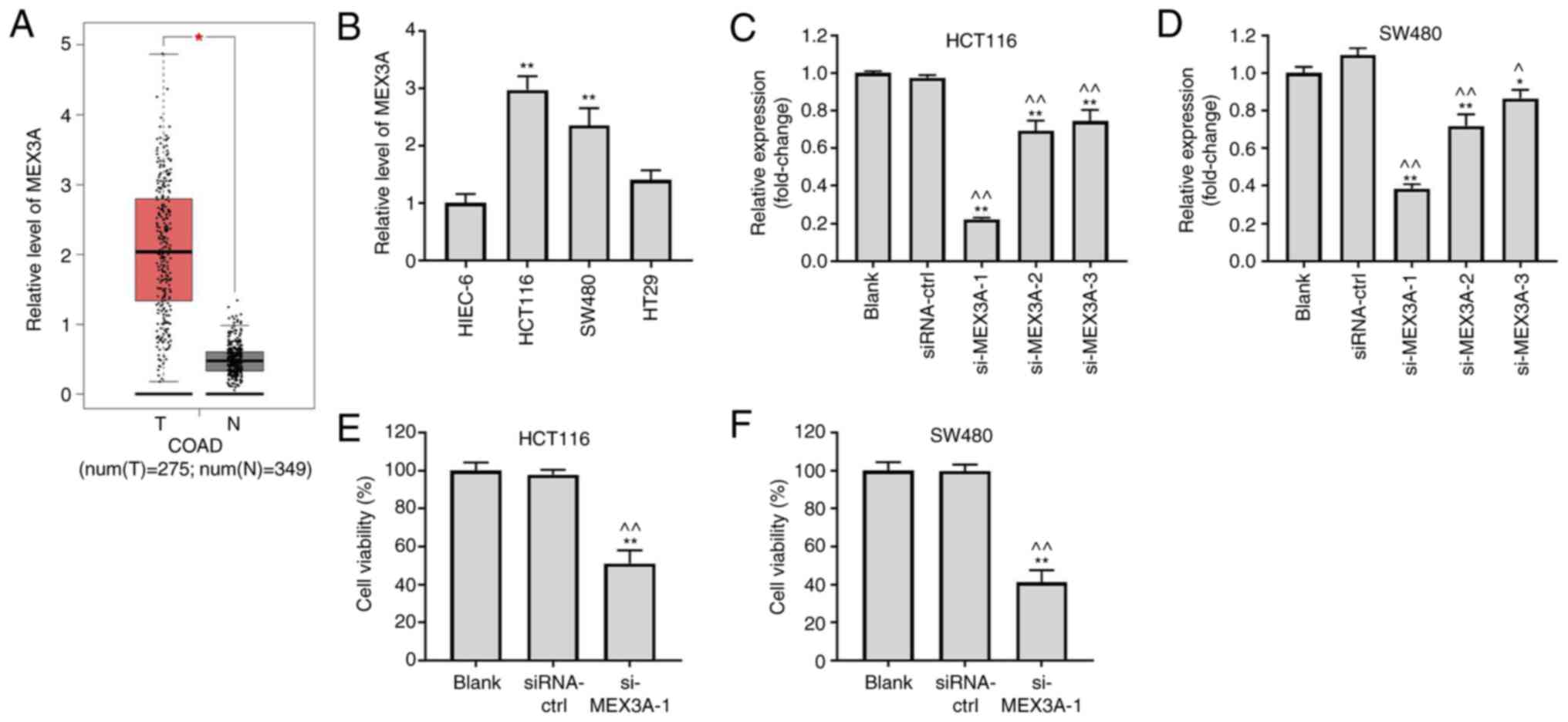 The expression levels of MEX3A in CRC and adjacent healthy tissues were obtained from The Cancer Genome Atlas (TCGA). Data from TCGA were analyzed using the Gene Expression Profiling Interactive Analysis database (GEPIA; http://gepia.cancer-pku.cn/), as previously described (14).