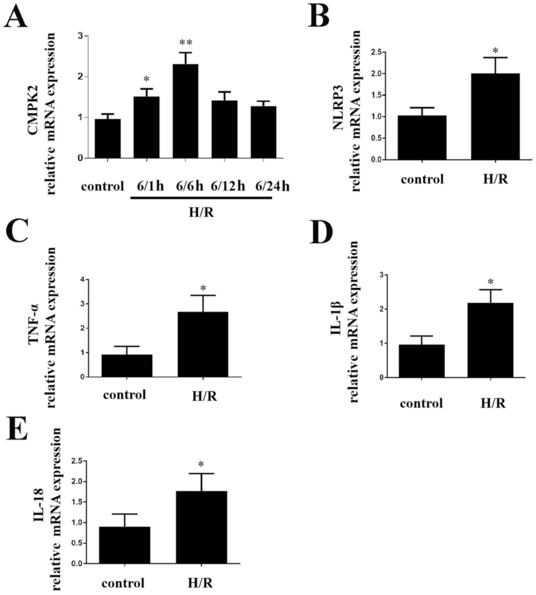 In order to determine the impact of CMPK2 on H/R-induced inflammatory response in cells, the present study first detected the CMPK2 levels. CMPK2 (Fig. 1A), NLRP3 (Fig. 1B) and TNF-α, IL-1β and IL-18 (Fig. 1C-E, respectively) mRNA expression levels were increased in RAW 264.7 cells compared with the control group. After reoxygenation for 6 h, CMPK2 mRNA levels were significantly higher (Fig. 1A). Therefore, 6/6 h was selected as an appropriate H/R time node (Fig. 1A). The results demonstrated that increased CMPK2 is likely to be associated with liver I/R.
