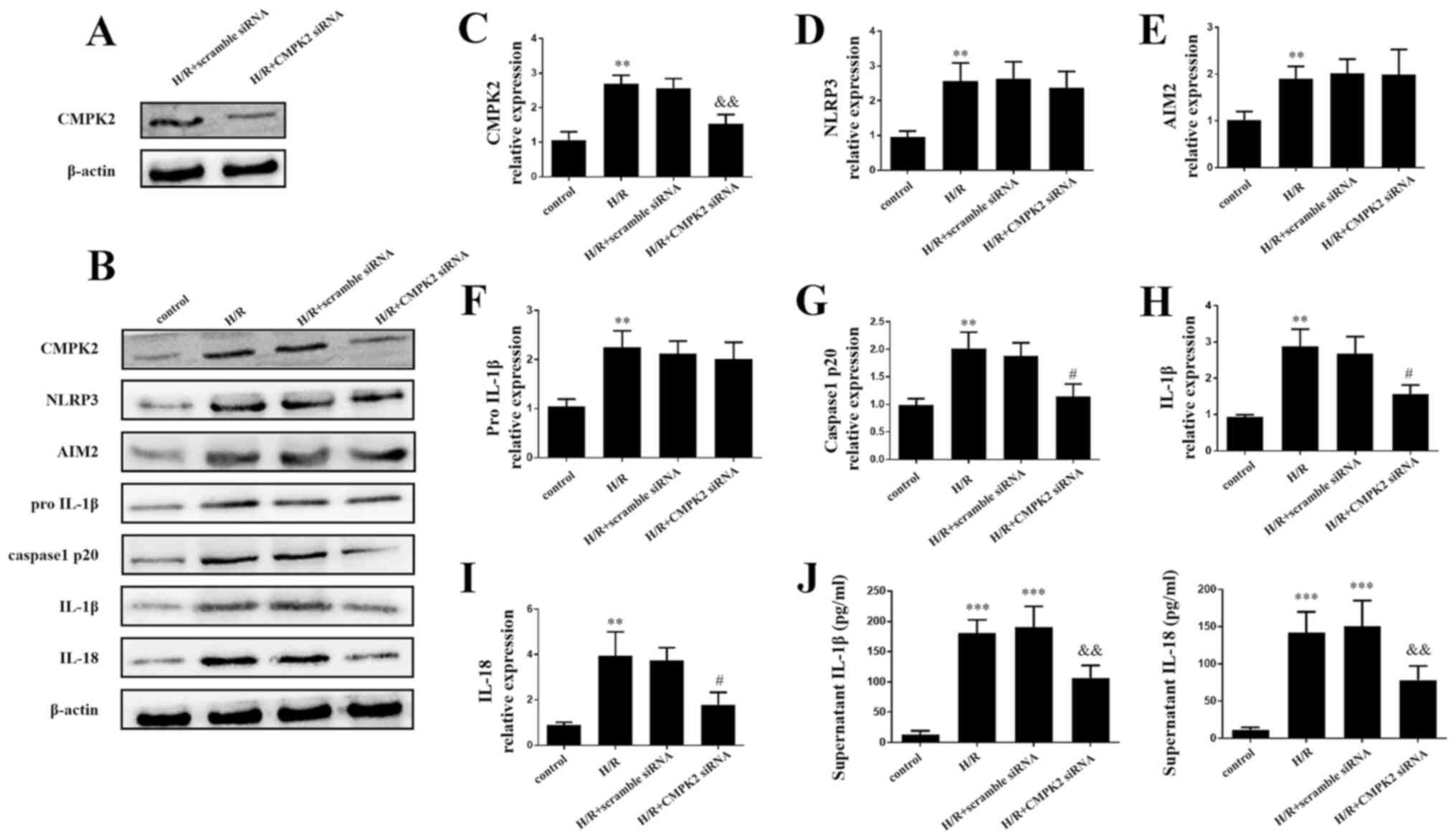 For the H/R + siCMPK2 group, CMPK2 siRNA was transfected into RAW 264.7 cells using Lipofectamine® 3000 (Thermo Fisher Scientific, Inc.), and then cells were transferred to complete medium 6 h after transfection at 37˚C, 24 h before the H/R treatment, according to the manufacturer's protocol. Similarly, for the H/R + scramble siRNA, H/R + siNLRP3, H/R + siAIM2, H/R + NLRP3 siRNA + CMPK2 siRNA and H/R + AIM2 siRNA + CMPK2 siRNA groups, scramble siRNA, NLRP3 siRNA, AIM2 siRNA, NLRP3 siRNA + CMPK2 siRNA and AIM2 siRNA + CMPK2 siRNA were transfected into RAW 264.7 cells in the same way, respectively, and then cells were transferred to complete medium 6 h after transfection at 37˚C, 24 h before the H/R treatment.