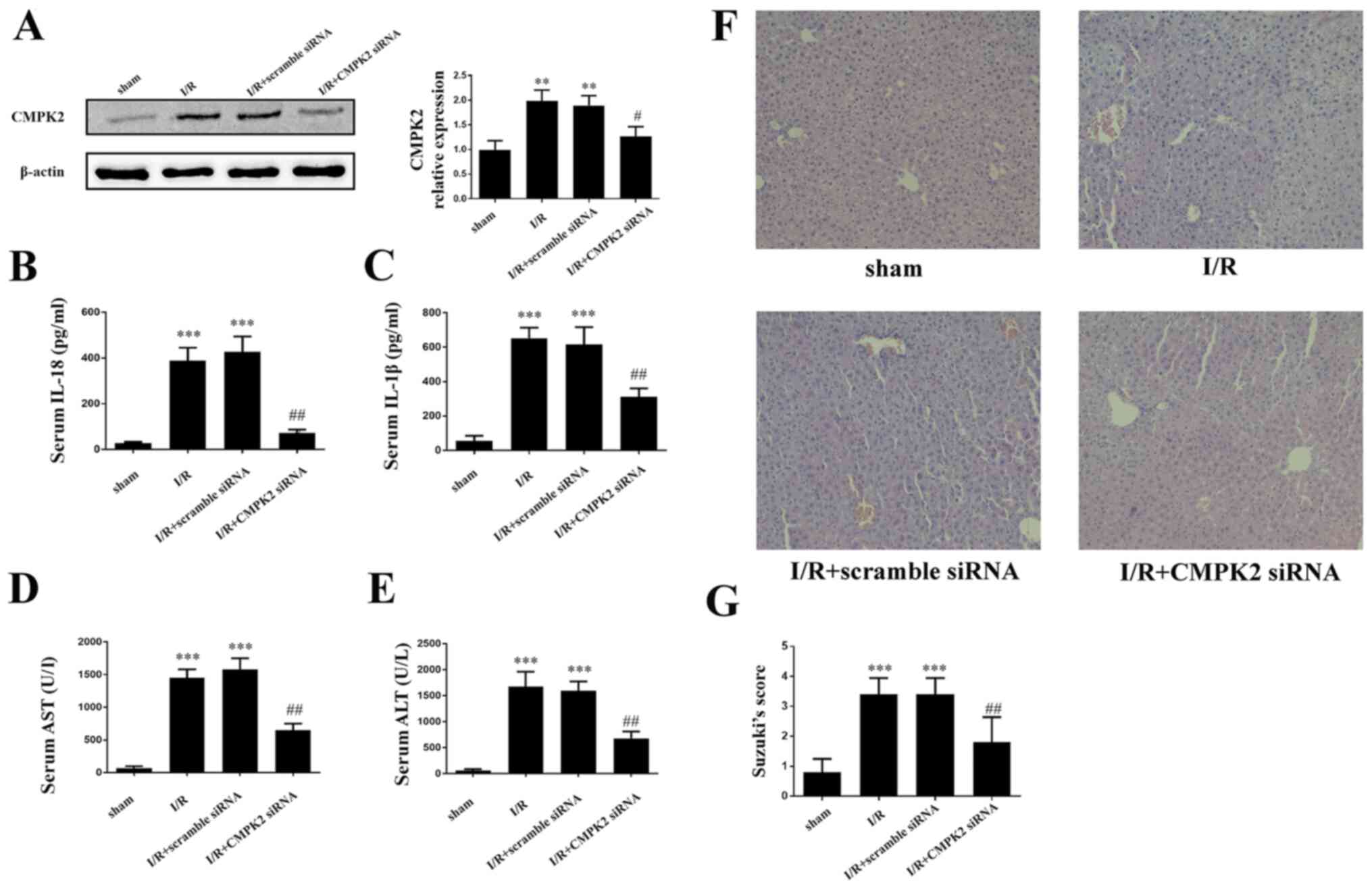Compared with the scramble siRNA group, the amelioration of cellular swelling, bubble degeneration and inflammatory cell infiltration were detected in the CMPK2 knockdown group following hepatic I/R (Fig. 4F and G).
