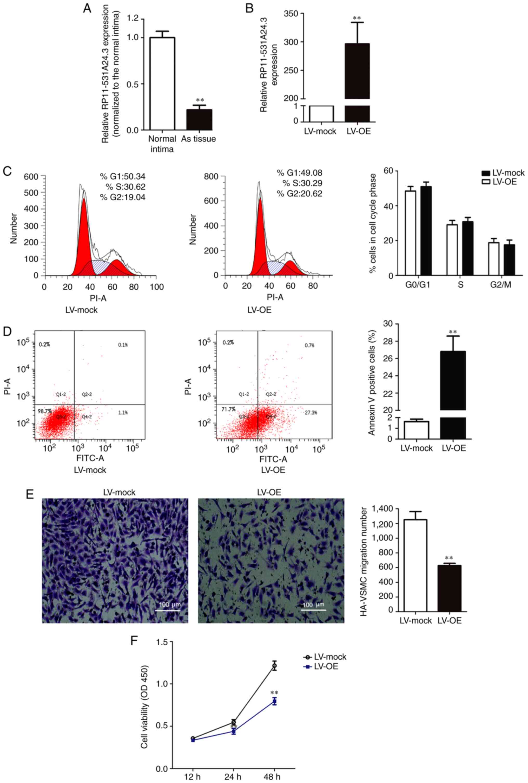 HA-VSMCs were infected with LV-mock or LV-OE (Fig. 1B). A series of gain-of-function studies were performed in HA-VSMCs to investigate the regulatory effect of RP11-531A24.4 on the phenotypes of VSMCs (Fig. 1C-F). The first study was conducted to investigate whether RP11-531A24.3 was involved in cell cycle distribution and apoptosis. The flow cytometry analysis showed no significant difference in the number of cells in the G0/G1 phase, S phase and G2/M phase between the LV-OE and LV-mock groups (Fig. 1C). The cell apoptosis test showed that the apoptotic rate was significantly increased in the LV-OE group compared with in LV-mock group (Fig. 1D). The Transwell assay indicated that overexpression of RP11-531A24.3 significantly inhibited the migration of HA-VSMCs compared with LV-mock (Fig. 1E). The CCK-8 assay showed that overexpression of RP11-531A24.3 reduced the viability of the cells in comparison with a control (Fig. 1F). Taken together, these results demonstrated that RP11-531A24.3 inhibited migration and increased apoptosis, while it had no effect on the cell cycle distribution of these cells.