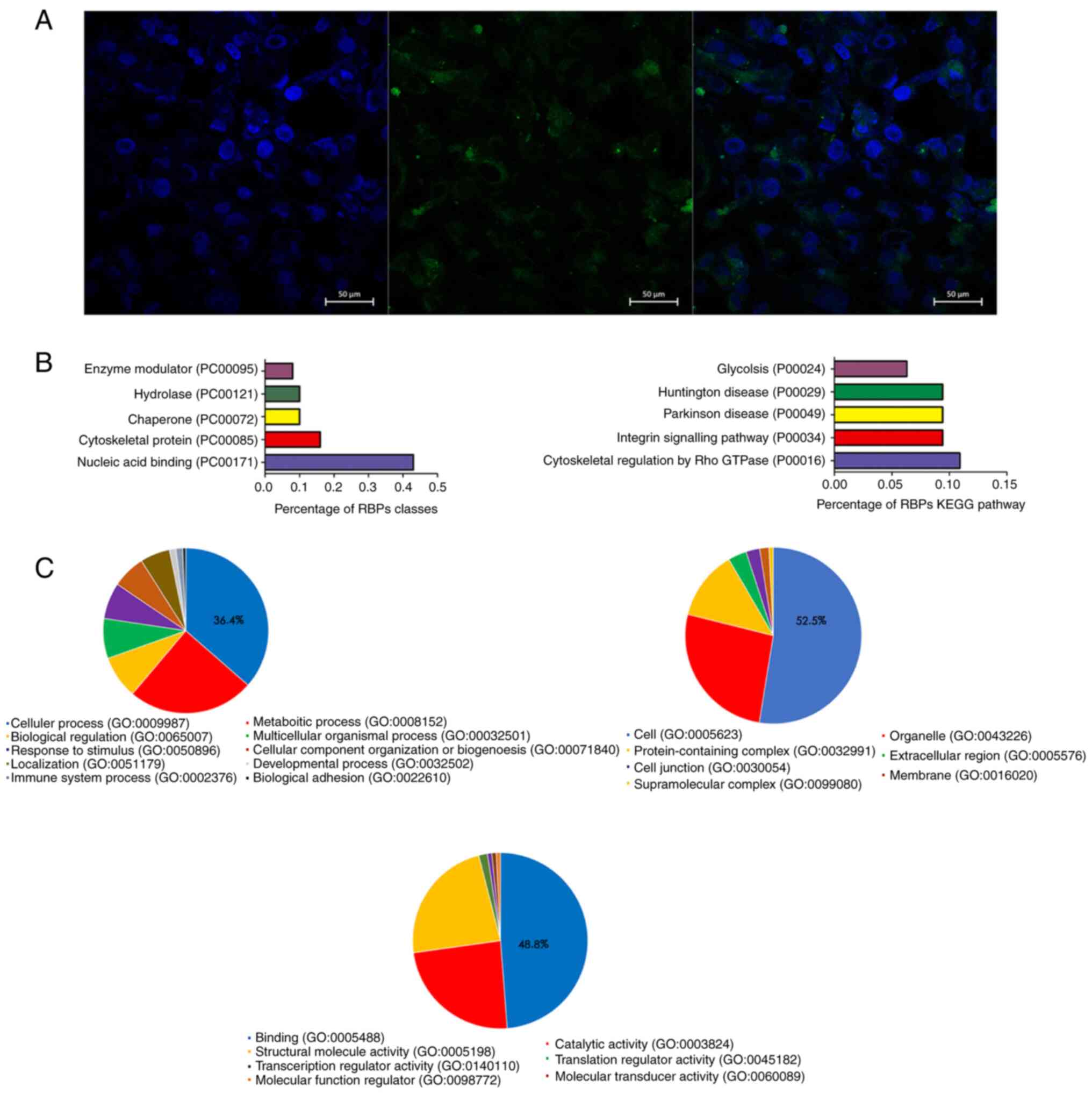 Non-coding RNAs, including microRNAs, circular RNAs and lncRNAs, are considered to serve central roles in the regulation of phenotypic transformation of SMCs, involving changes in migration, proliferation, apoptosis, and ECM-generating capacity (16,35,36). The subcellular localization of lncRNA is likely to define its network of interactions with other macromolecules and their functions (15). In the present study, FISH indicated the cytoplasmic localization of RP11-531A24.3, while RAP and LC-MS indicated its RBPs were enriched in the pathway terms closely related to migration. These results were consistent with phenotypic changes caused by RP11-531A24.3.