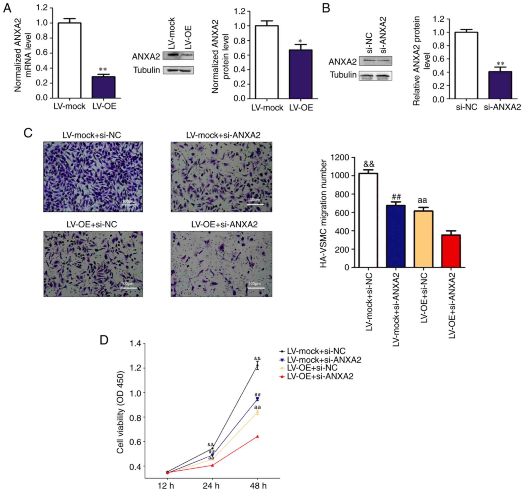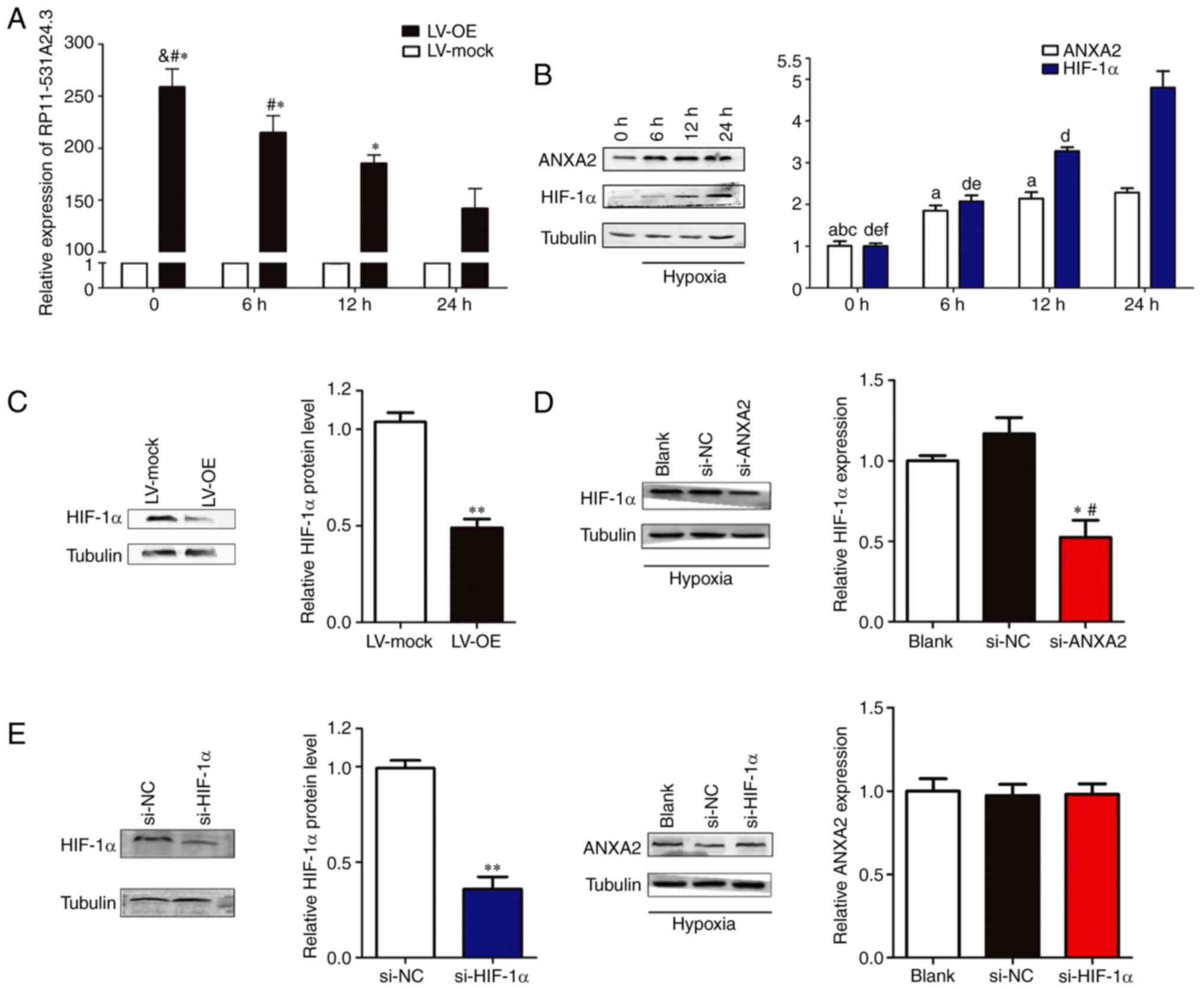 Human aortic (HA-)VSMCs (cat. no. CRL-1999) were obtained from the American Type Culture Collection and authenticated via STR profiling. Dulbecco's modified Eagle's medium (DMEM), fetal bovine serum (FBS), penicillin, streptomycin, puromycin, bovine serum albumin and polybrene were purchased from Gibco (Thermo Fisher Scientific, Inc.). Empty lentivirus vector (anti-puromycin; LV-mock), LV-mediated lncRNA RP11-531A24.3 overexpression vector (anti-puromycin; LV-OE), small interfering (si)RNA targeting annexin A2 (ANXA2) and its corresponding si-negative control (si-NC; cat. no. SIGS0005567-1), and the siRNA targeting HIF-1α and its corresponding si-NC (cat. no. SIGS0002003-1) were constructed and purchased from Guangzhou RiboBio Co., Ltd. An Annexin V-APC/7-aminoactinomyosin (7-AAD) Apoptosis Detection kit (cat. no. KGA1023) and a Cell Cycle Detection kit (cat. no. KGA512) were obtained from Nanjing KeyGen Biotech. Co., Ltd. Cell Counting Kit-8 (CCK-8; cat. no. C0039) was purchased from Beyotime Institute of Biotechnology and Transwell chambers (cat. no. 3422) from BD Biosciences. Lipofectamine 3000 was purchased from Life Technologies. Co., Ltd. TRIzol® was purchased from Invitrogen; Thermo Fisher Scientific, Inc. A PrimeScript II 1st Strand cDNA Synthesis kit and a SYBR Green PCR kit were purchased from Takara Biotechnology Co., Ltd. An All-in-One First-Strand cDNA Synthesis kit was purchased from GeneCopoeia, Inc. RIPA lysis buffer was purchased from Hangzhou Fude Biological Technology Co., Ltd. Antibodies targeting ANXA2 (rabbit polyclonal; cat. no. ab235939) and β-tubulin (rabbit polyclonal; cat. no. ab6046) were purchased from Abcam, while antibody targeting HIF-1α (rabbit polyclonal; cat. no. AF1009) was purchased from Affinity Biosciences. ECL Western Blotting Substrate was purchased from Promega Corporation. RNA Antisense Purification Kit (cat. no. Bes 5103-2; BersinBio) was used in the RNA antisense purification (RAP) experiment (http://bersinbio.com/Product/detail/id/14.html). All reagents were used according to the manufacturers' protocol.