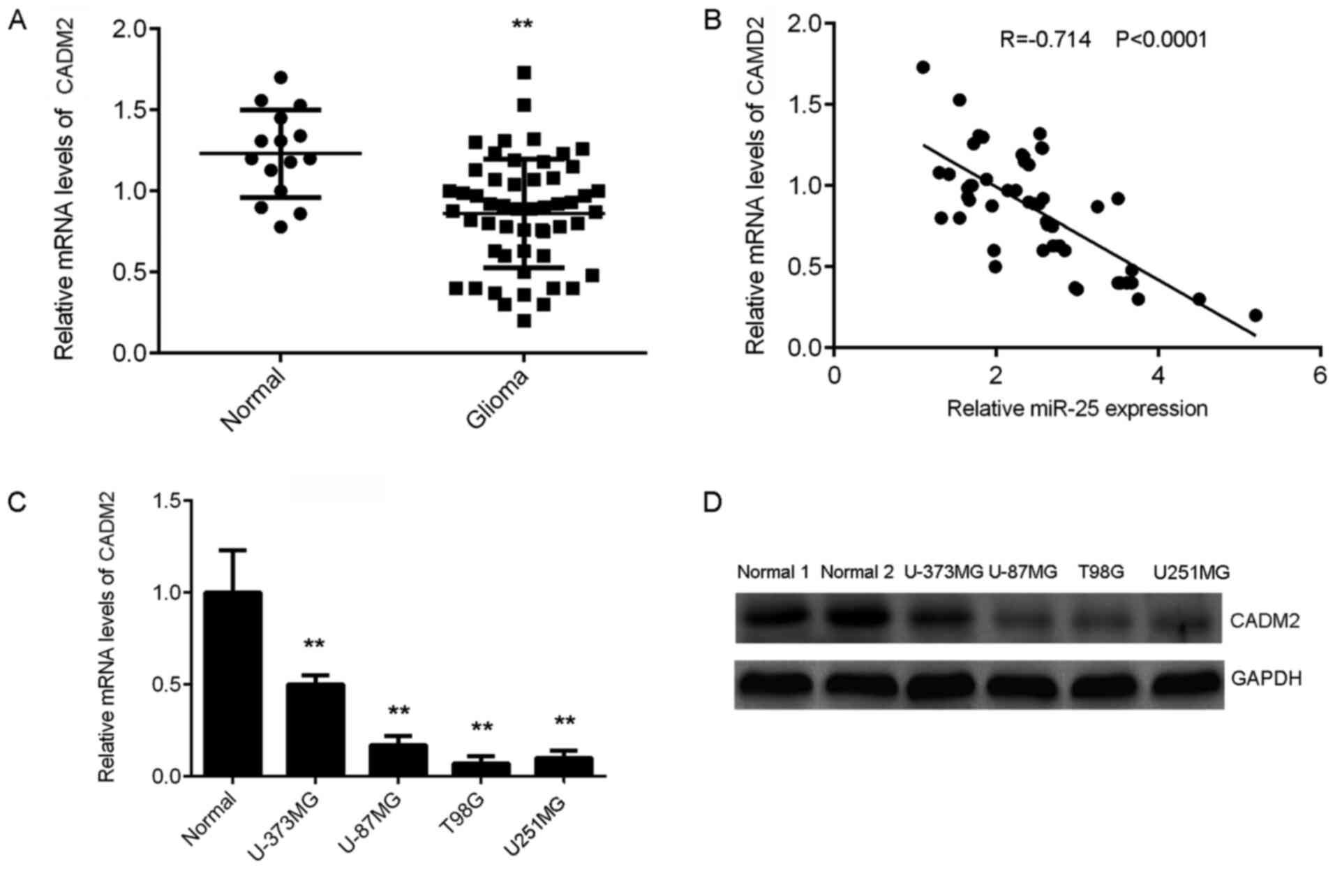 Total RNA was isolated from tissues or T98G and U251MG cells using TRIzol® reagent (Thermo Fisher Scientific, Inc.). The total RNA was then reverse transcribed using PrimeScript II 1st Strand cDNA Synthesis kit (Takara Bio, Inc.), according to the manufacturer's protocol. The cDNA was amplified by qPCR using SensiFAST™ SYBR® Hi-ROX Mix (Bioline), with U6 and GAPDH as internal references to normalize expression data. The thermocycling conditions were as follows: Initial denaturation at 95˚C for 3 min; 40 cycles at 95˚C for 30 sec and 60˚C for 30 sec. The primer sequences were as follows: miR-25 forward, 5'-CTGGTAGGCATTGCACTTGTCT-3' and reverse, 5'-TCAACTGGTGTCGTGGAG-3'; U6 forward, 5'-CTCGCTTCGGCAGCACATATACT-3' and reverse, 5'-CGCTTCACGAATTTGCGTGT-3'; GAPDH forward, 5'-CTGGGCTACACTGAGCACC-3' and reverse, 5'-AAGTGGTCGTTGAGGGCAATG-3'; CADM2 forward, 5'-AAACTTCCAAGGCATATCTCACC-3' and reverse, 5'-TGCGATTTGCATCCTCTTCTT-3'. Relative gene expression levels were analyzed according to the 2-IICq method (23).