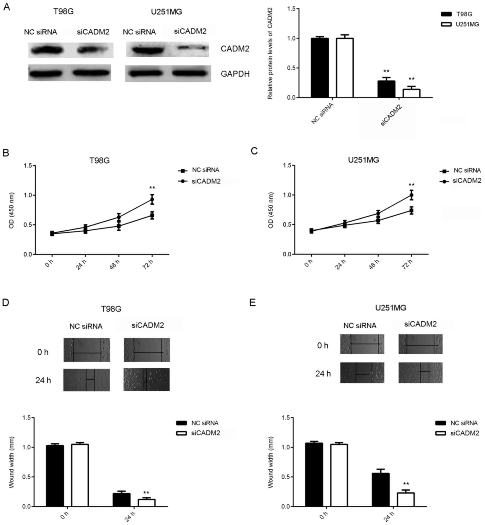 Based on the aforementioned findings, it was hypothesized that CADM2 may be involved in the miR-25-mediated proliferation and migration of glioma cells. To test this hypothesis, T98G and U251MG cells were transfected with NC siRNA or siCADM2. After transfection, the protein expression levels of CADM2 were significantly reduced in the siCADM2 group compared with the NC siRNA group (Fig. 5A). CCK-8 and wound healing assays were performed to assess cell proliferation and migration. As shown in Fig. 5B-E, the knockdown of CADM2 significantly increased the proliferation and migration of glioma cells. These findings suggested that CADM2 serves a suppressive role in glioma cell proliferation and migration.