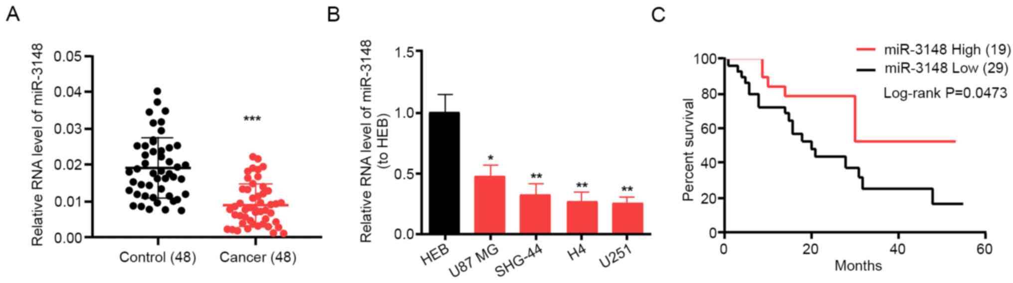 Liu et al (19) have reported that miR-3148 is evidently decreased in glioma. However, no studies have reported whether miR-3148 plays a role in glioma. Here, 48 clinical specimens of human glioma were collected to examine miR-3148 expression levels in cancerous and non-cancerous tissues. miR-3148 was expressed in glioma tissues at a lower level compared with that in non-tumor tissues (Fig. 1A). Additionally, miR-3148 was expressed in glioma cells at a notably lower level compared with that in the HEB cell line. miR-3148 expression reached the maximum in the U87 MG cell line and was the minimum in the U251 cell line (Fig. 1B); therefore, these two cell lines were selected as research models for the subsequent assays. Furthermore, patients with high miR-3148 expression had a higher survival rate compared with those with low miR-3148 expression (Fig. 1C). The average expression level was used as the cutoff. These results suggest that miR-3148 is downregulated in gliomas and is associated with survival and prognosis.