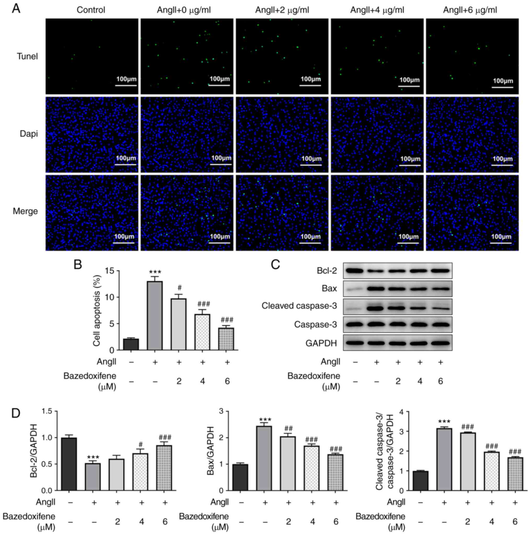 To determine the effect of bazedoxifene on the apoptosis of AngII-induced HUVECs, TUNEL staining was performed. The results demonstrated that the apoptotic rate in the AngII-treated alone group was significantly higher compared with that in the control group; however, bazedoxifene treatment could decrease cell apoptosis (Fig. 2A and B). These results were further confirmed by the detection of apoptosis-related protein expression levels. As presented in Fig. 2C and D, bazedoxifene could decrease Bax and cleaved caspase-3 protein expression levels in the AngII-induced HUVECs compared with the AngII-induced HUVECs alone group; however, bazedoxifene increased the expression level of the anti-apoptosis protein Bcl-2. These findings demonstrated that bazedoxifene may inhibited the AngII-induced apoptosis of endothelial cells.