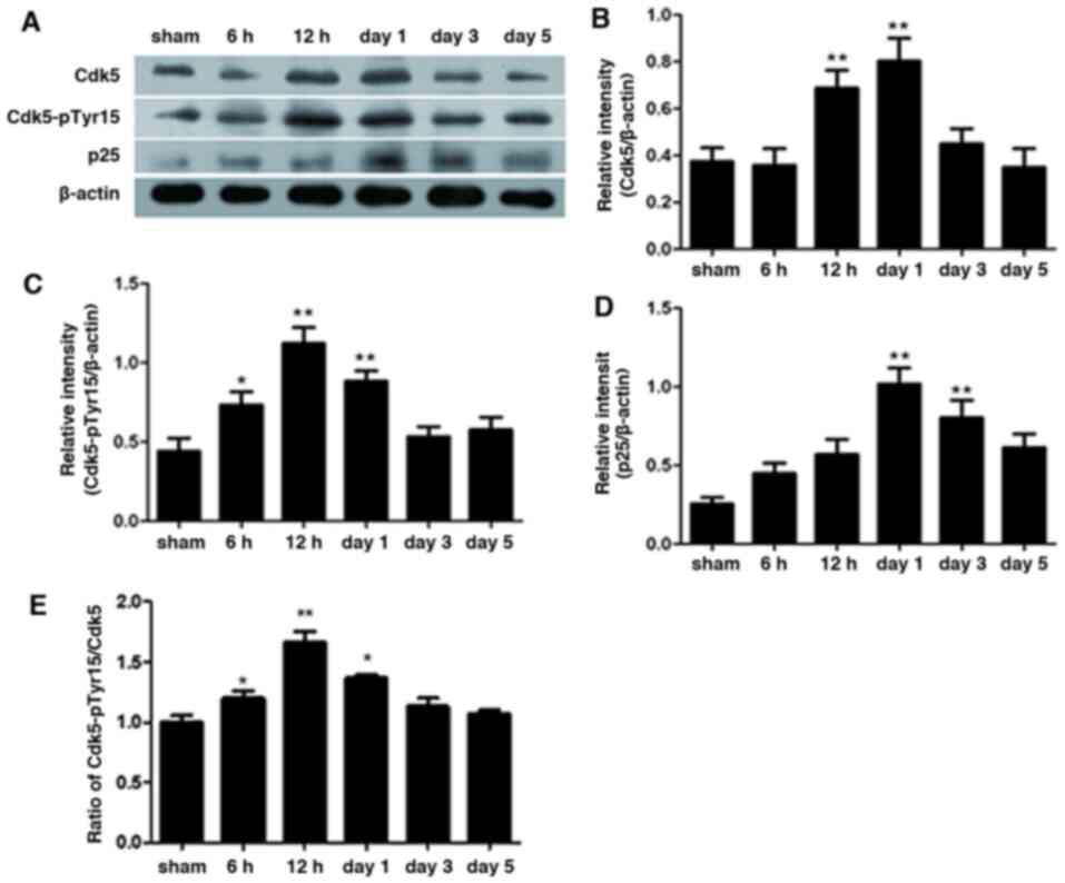 The sham group exhibited low expression levels of Cdk5 and Cdk5-pTyr15 (Fig. 1A-C). However, following SAH, Cdk5 and Cdk5-pTyr15 expression level were significantly upregulated in the SAH group compared with those in the sham group. The expression of Cdk5 peaked on day 1, whereas Cdk5-pTyr15 expression peaked at 12 h following SAH (P<0.01; Fig. 1B and C). The time course of p25 expression was similar to those of Cdk5 and Cdk5-pTyr15, where p25 protein levels increased significantly and peaked on day 1 after SAH (P<0.01; Fig. 1D) in SAH group compared with those in the sham group. The protein ratio of Cdk5-pTyr15/Cdk5 expression is presented in Fig. 1E. Following SAH, the protein ratio of Cdk5-pTyr15/Cdk5 expression were significantly regulated in the SAH group compared with those in the sham group, which peaked at 12 h following SAH (P<0.01; Fig. 1E).