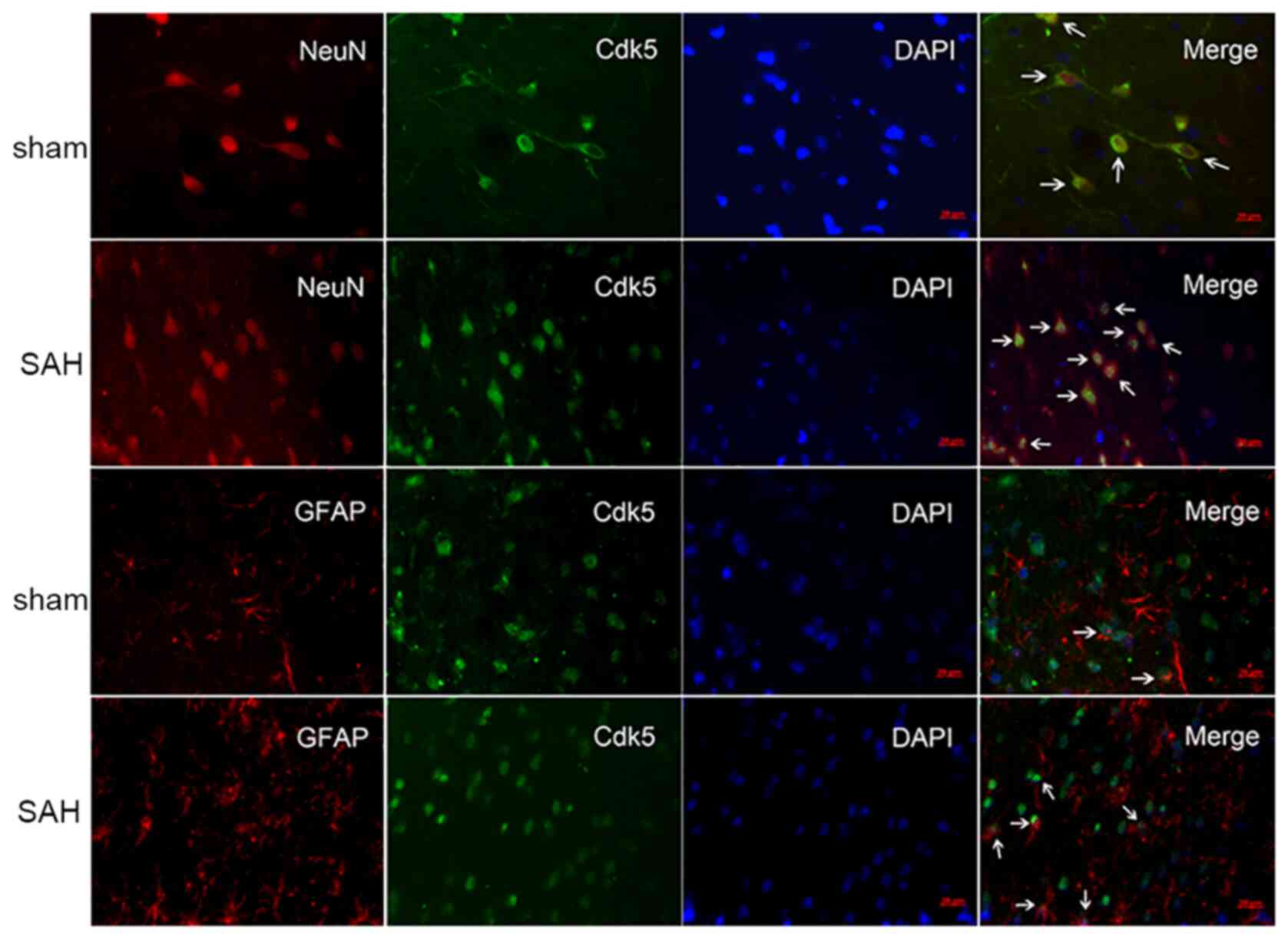 Cdk5 was colocalized with neuronal nuclei in the sham and SAH groups, suggesting that Cdk5 is expressed in both healthy and post-SAH rat brain neurons. Following SAH, Cdk5 translocated to the nucleus in the SAH group but not in the sham group (Fig. 2). Cdk5 was weakly expressed in glial fibrillary acidic protein-positive cells of the sham group; however, enhanced Cdk5 immunoreactivity was observed in the astrocytes of the SAH group, demonstrating that Cdk5 is activated in astrocytes following SAH (Fig. 2).