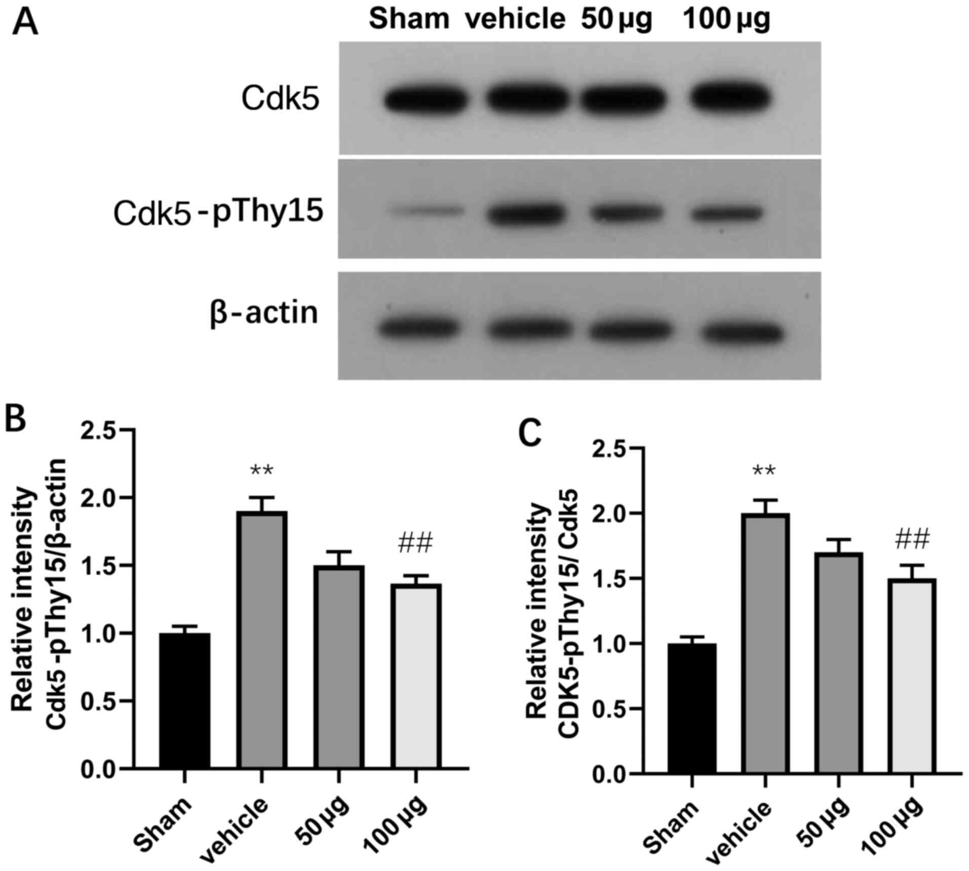 The SAH + roscovitine group exhibited significantly upregulated Cdk5-pTyr15 expression in the temporal cortex on day 1 after SAH compared with the sham + vehicle group (P<0.01; Fig. 3). Moreover, treatment with roscovitine suppressed Cdk5-pTyr15 expression in a dose-dependent manner in the SAH + roscovitine group, and treatment with high-dose roscovitine (100 µg) significantly inhibited Cdk5-pTyr15 expression in the SAH + roscovitine group compared with the SAH + vehicle group (P<0.01; Fig. 3).