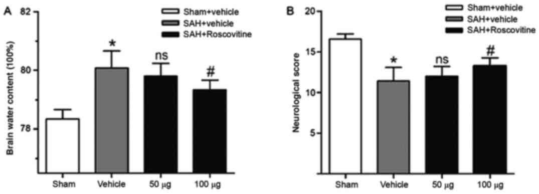 The SAH + vehicle group demonstrated significantly lower neurological scores compared with the sham + vehicle group; however, the rats that received roscovitine (100 µg) after SAH exhibited a significant increase in neurological scores compared with the SAH + vehicle group (P<0.05; Fig. 4B). However, no significant difference was revealed in neurological behavior between the SAH + roscovitine (50 µg) and SAH + vehicle groups.