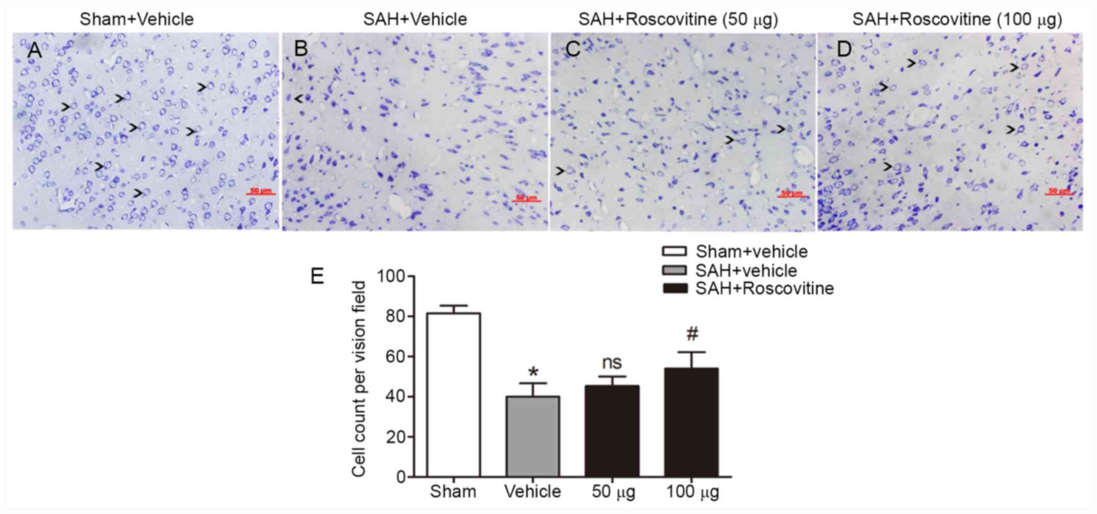 Nissl staining of the temporal cortex was performed to explore the neuroprotective effect of roscovitine. The sham + vehicle group exhibited neuronal cells with clear outline and compact structures and cytoplasm (Fig. 5A). After SAH, the majority of neurons were damaged and exhibited extensive degenerative changes. The neurons were sparsely arranged, appeared to have lost their integrity, and exhibited shrunken cytoplasm and swollen cell bodies (Fig. 5B-D). However, roscovitine (100 µg) treatment significantly reduced the percentage of damaged neurons in the SAH + roscovitine (100 µg) group compared with that in the SAH + vehicle group (P<0.05; Fig. 5E).
