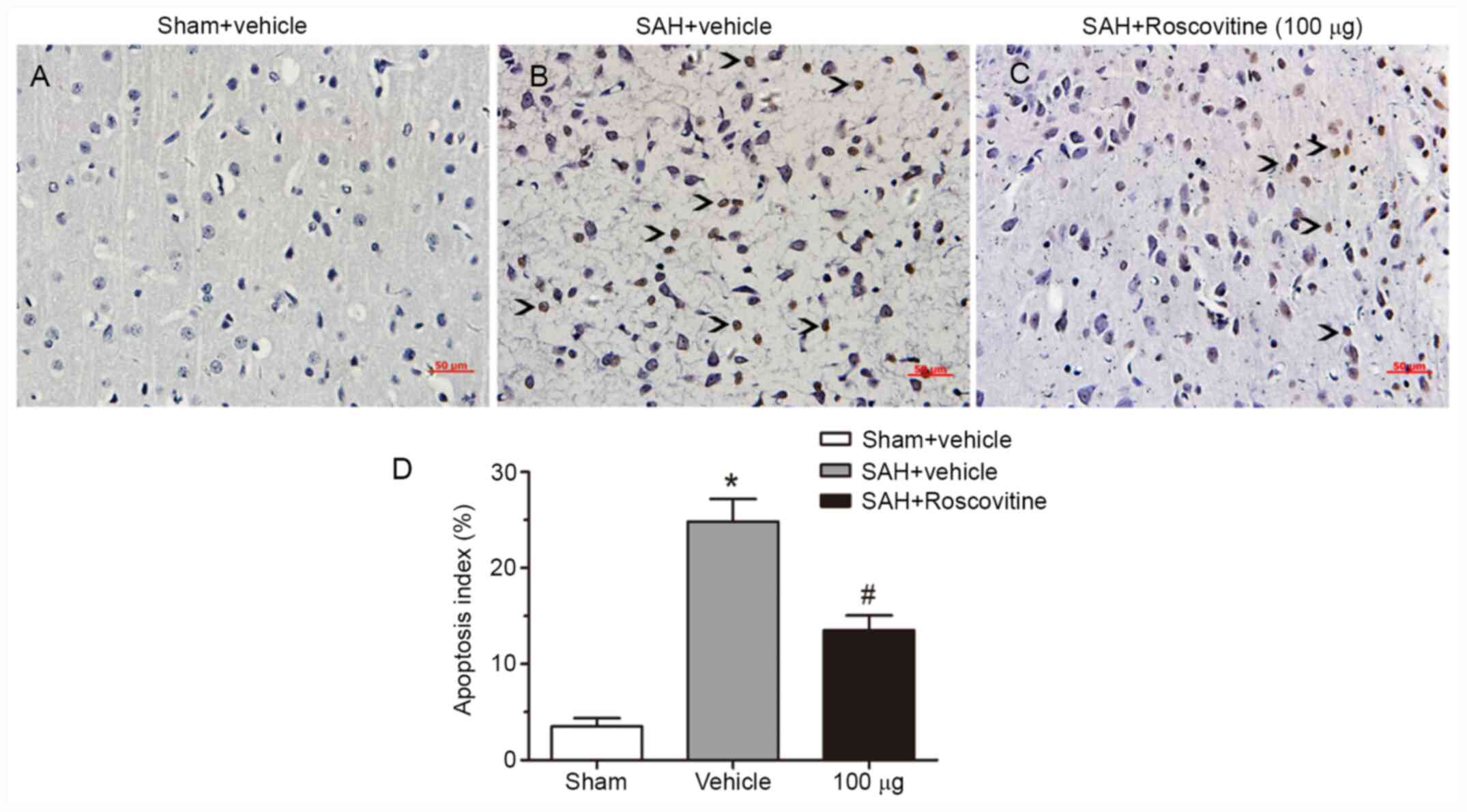The dose of 100 µg of roscovitine was selected for this experiment because it was determined to be most effective dose based on the results of the above-described experiments. Few TUNEL-positive neurons were found in the temporal cortex of the sham + vehicle group (Fig. 6A-C). The SAH + vehicle group demonstrated a significantly increased percentage of apoptotic neurons compared with the sham + vehicle group; however, roscovitine treatment (100 µg) significantly reduced the percentage of TUNEL-positive cells in the SAH + roscovitine (100 µg) group compared with the SAH + vehicle group (Fig. 6D). These results indicated that roscovitine treatment alleviated neuronal apoptosis after SAH.