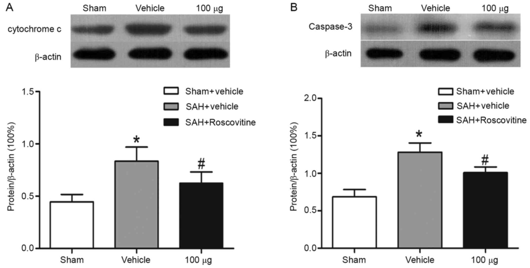 Compared with the sham + vehicle group, the SAH + vehicle group displayed significantly increased expression levels of cytochrome c and caspase-3 (P<0.05; Fig. 7A and B). However, cytochrome release and caspase-3 cleavage were both significantly decreased after roscovitine (100 µg) treatment in the SAH + roscovitine (100 µg) group compared with the SAH + vehicle group (Fig. 7A and B).