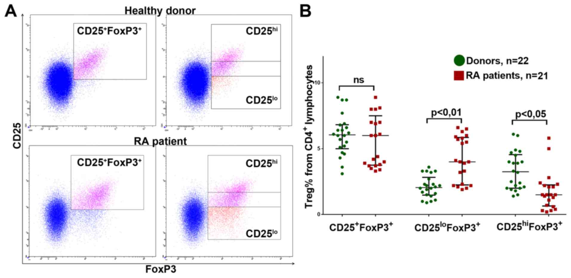 Some differences were also found between donors and patients with RA from the common group. Investigating CD86 expression on the surface of Treg, it was found that in patients with RA, the percentage of CD86+CD25+FoxP3+ cells was significantly higher (Fig. 6B).