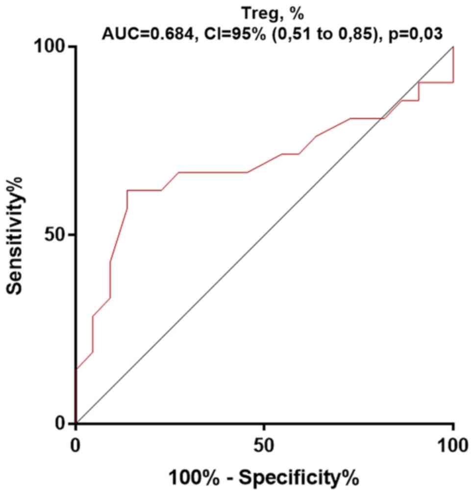 In addition, receiver operating characteristics (ROC) curves were plotted for the Treg percentage (Fig. 2). The area under the ROC curve, of the Treg percentage for the RA prediction was 0.68, showing its low predictive ability (P=0.03). This confirmed the absence of a significant difference between donors and RA patients in the percentage of Tregs.
