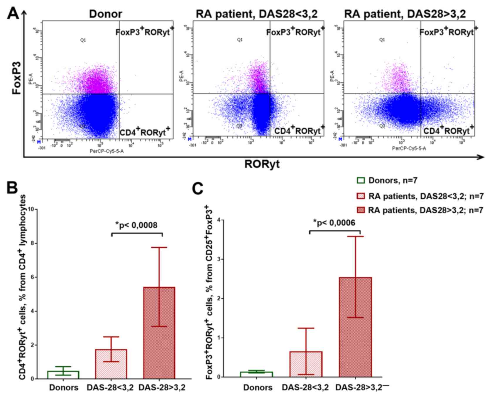 Fig. 3A shows the examples of the flow cytometry plots reflecting the gating of the CD4+RORyt+ and FoxP3+RORyt+ cells. Patients with medium and high disease activity had significantly more RORyt-expressing cells compared with that in the healthy donors and patients with low activity, both in CD4+ cells and in CD25+FoxP3+Treg cells (Fig. 3B and C). At the same time, FoxP3+RORyt+ had relatively low CD25 expression (data not shown).