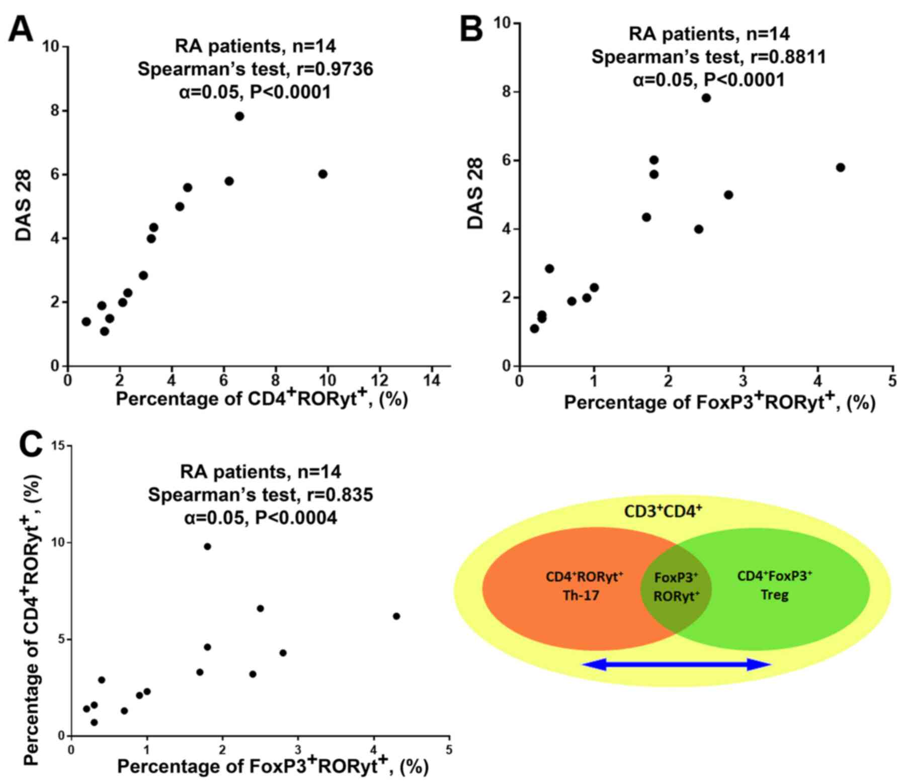 RORyt is the main transcription factor for Th17 lymphocytes; therefore, FoxP3+RORyt+ cells are the Treg-to-Th17 transition stage (29). Thus, Treg cells in the patients were more prone to differentiate into Th17(29). Furthermore, a strong correlation was found between the percentage of CD4+RORyt+ cells and DAS-28, and between the percentage of FoxP3+RORyt+ cells and DAS-28, which suggested that the process of transdifferentiation from Treg to Th17 could be involved in the pathogenesis of RA (Fig. 4A and B; RA patients from the general group). Additionally, a strong correlation was found between the percentage of FoxP3+RORyt+ and CD4+RORyt+ cells, which indicates transdifferentiation between Treg cells and Th-17 lymphocytes. (Fig. 4C; RA patients from the general group) (30).