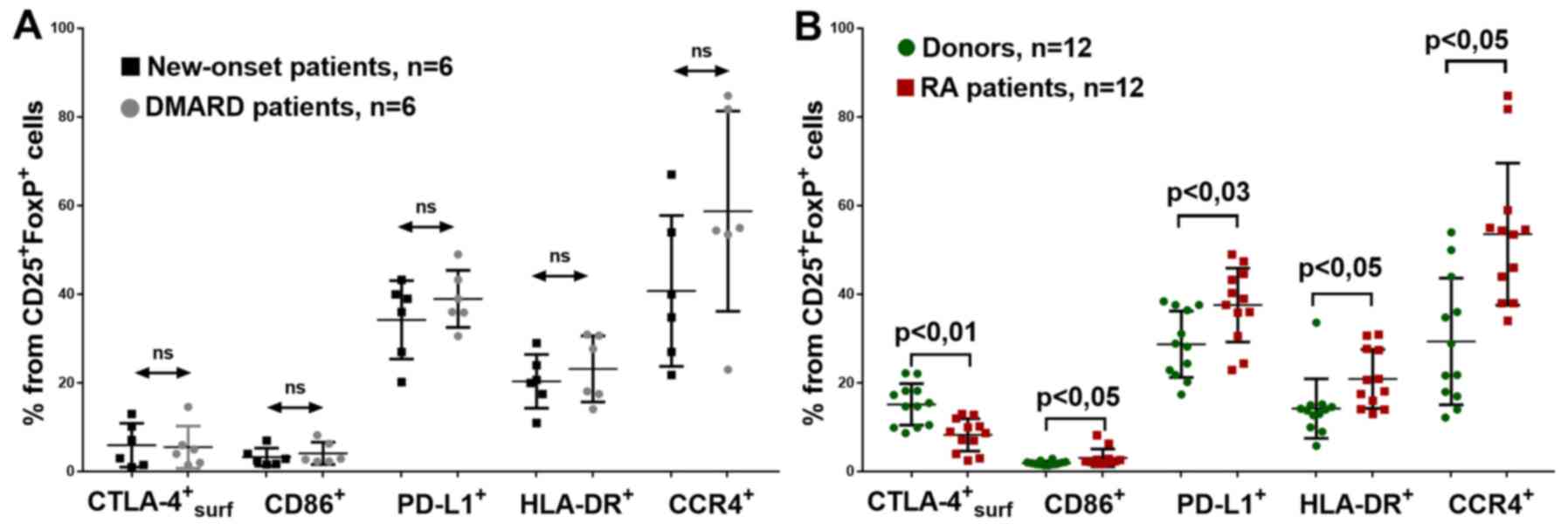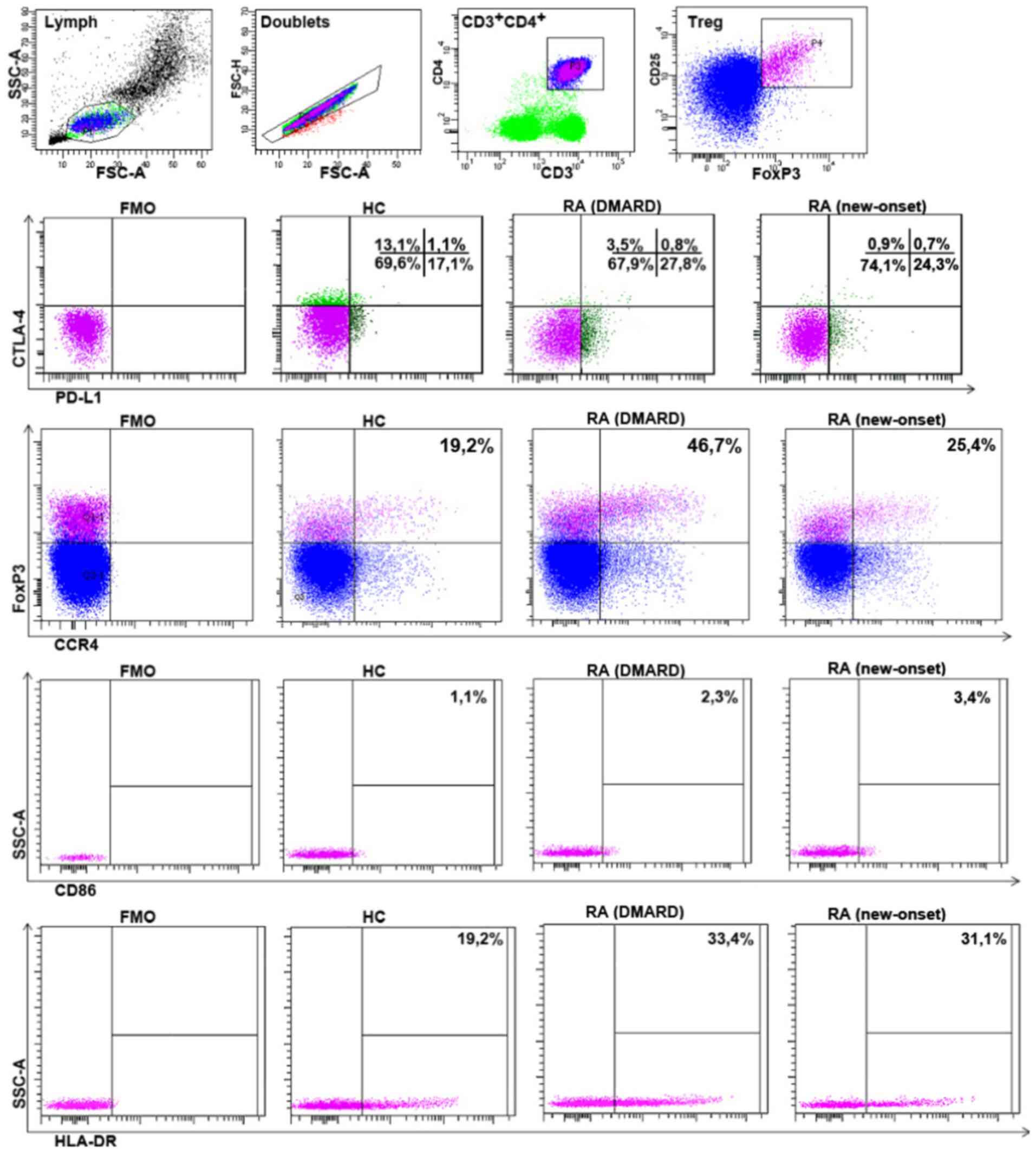 Thus, patients with RA had Treg cells with a lower CTLA-4 expression; however, they had higher PD-L1, CD86, HLA-DR and CCR4 expression.