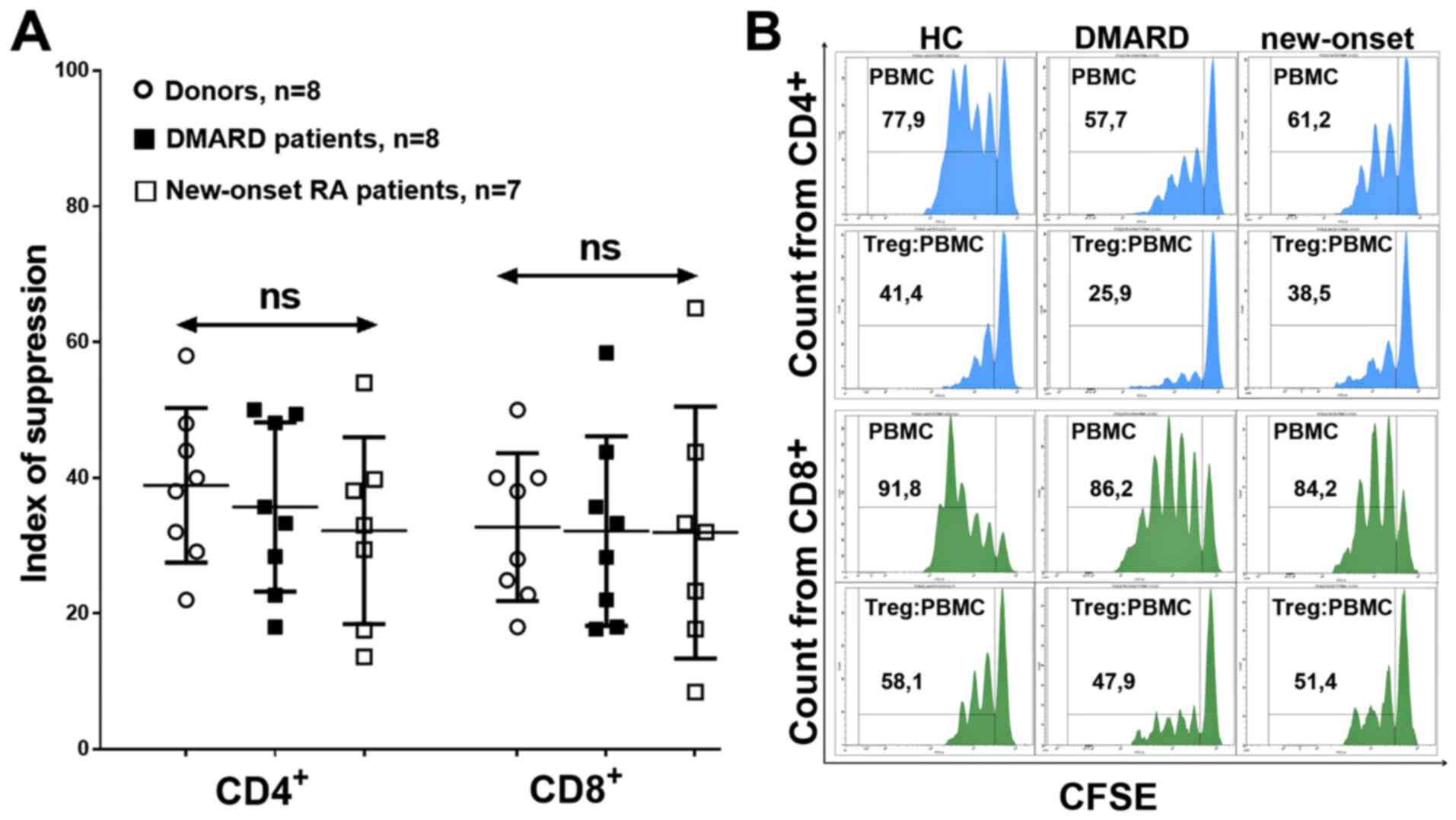 Suppression of proliferation was determined using the suppressor index, which did not differ in donors or different groups of patients, which indicated preserved suppressor activity of the general Treg cell pool in RA, with respect to both CD4+ and CD8+ (Fig. 8).