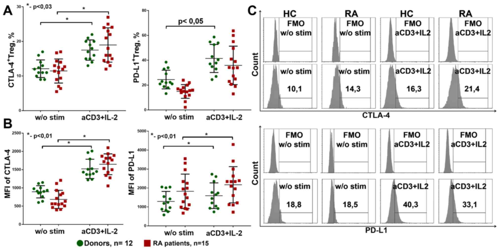 Stimulation with anti-CD3+IL-2 promoted PD-L1 and CTLA-4 expression on Treg cells in healthy donors and RA patients since IL-2 is one of the most important cytokines for Treg cell homeostasis, which, when combined with a strong signal using TCR, by anti-CD3 stimulation, can lead to activation and increasing suppressor capacity of Treg cells (3).