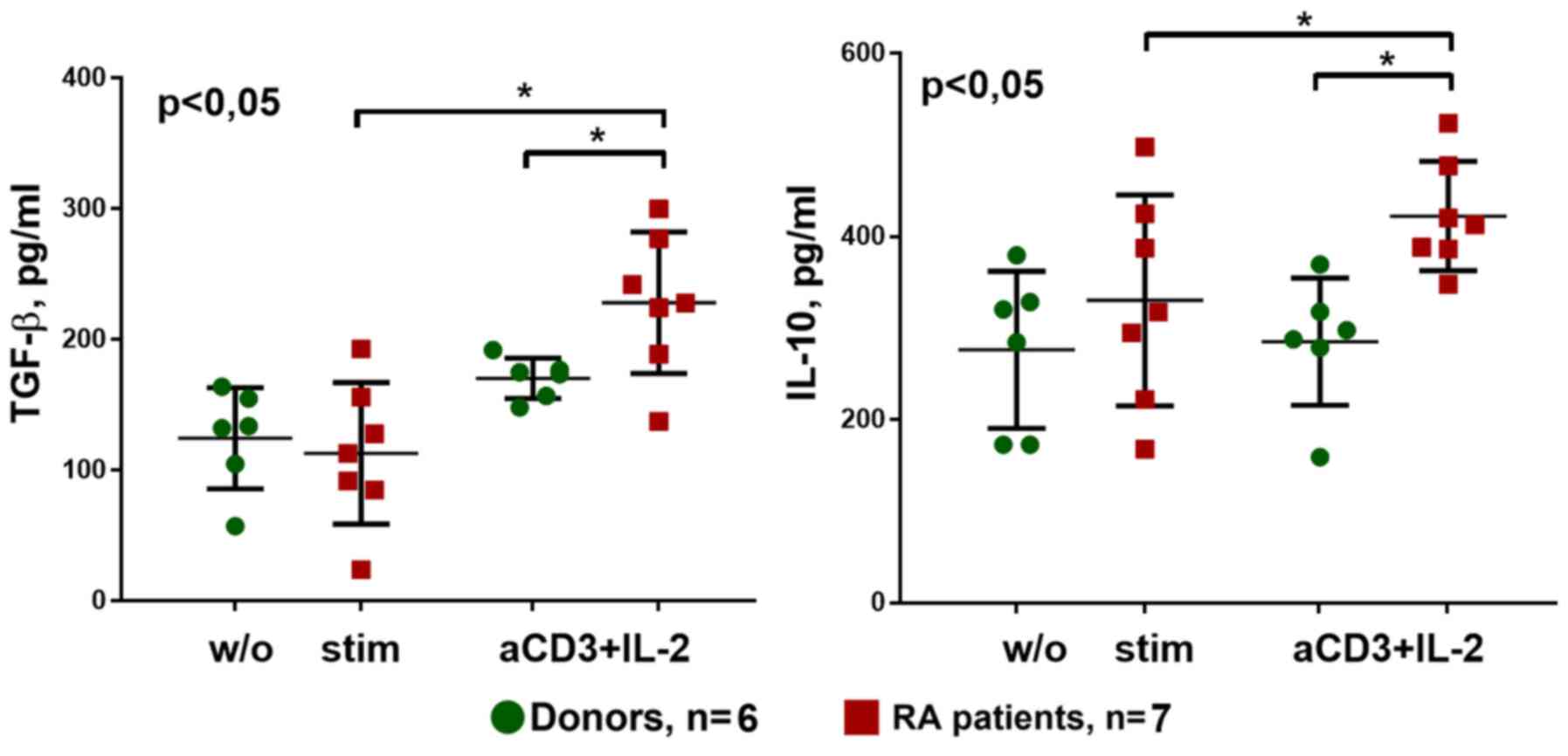 With respect to the secretion of cytokines during cultivation with anti-CD3 + IL-2 stimulation, TGF-β and IL-10 production was significantly higher in patients with RA compared with that in donors. In addition, anti-CD3+IL-2 stimulation increased secretion of these cytokines, particularly in the patient group (Fig. 10).
