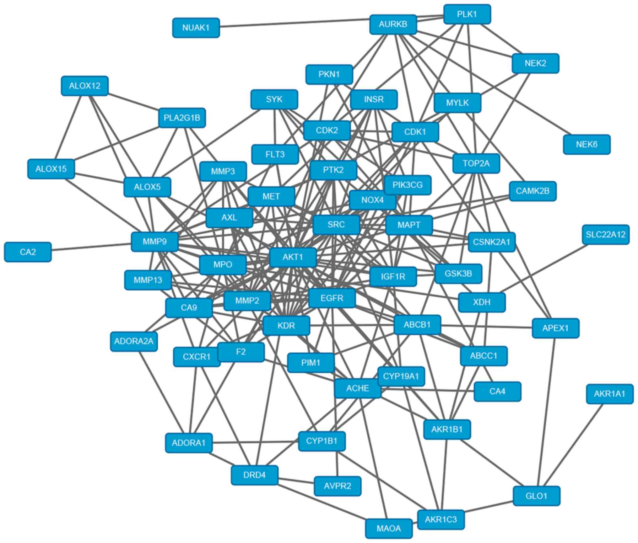 Daina A, Michielin O and Zoete V: SwissTargetPrediction: Updated data and new features for efficient prediction of protein targets of small molecules. Nucleic Acids Res. 47 (W1):W357–W364. 2019.PubMed/NCBI View Article : Google Scholar | |