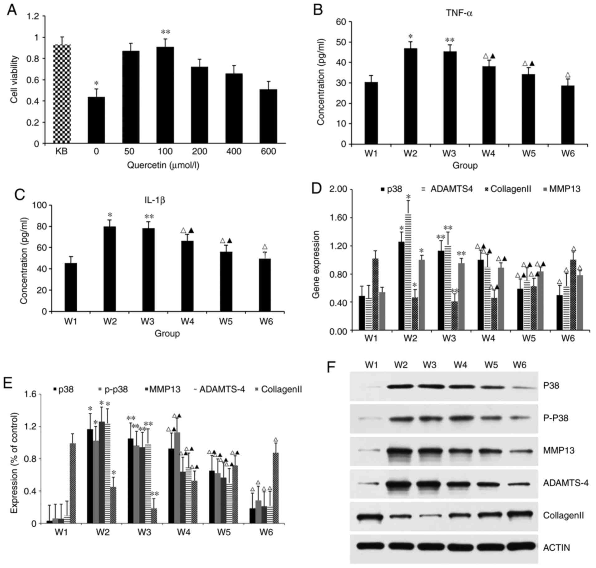 For mRNA levels, RT-qPCR results showed that the expression level of collagen II mRNA was highest in the W1 group and lowest in the W2 group. The expression of the MMP13 mRNA and p38 mRNA in the W1 group was lowest and highest in the W2 group, respectively. The significant difference shows that IL-1β at 10 ng/ml can stimulate the expression of MMP-13, p38 and ADAMTS-4 in chondrocytes, and inhibit the expression of type II collagen, causing chondrocyte degeneration. Meanwhile, compared with mRNA expression level in the W2 group, W3 expression level in the DMSO group was approximately the same, indicating that 0.1% DMSO had no effect on the expression of chondrocyte genes. Quercetin intervention in the W4, W5 and the W6 groups could effectively lower the expression levels of MMP-13 mRNA, p38 mRNA and ADAMTS-4 mRNA, compared with that in the W2 group, but it increased the expression of type II collagen in each group. However, when used in combination, the gene expression level changed more significantly and the difference was statistically significant, indicating that quercetin and the blocking agent SB203580 both have the same effect, and both can change the expression levels of genes associated with the p38 MAPK signaling pathway of chondrocytes; however, the effect of quercetin is weaker than that of the blocker (Fig. 3D).
