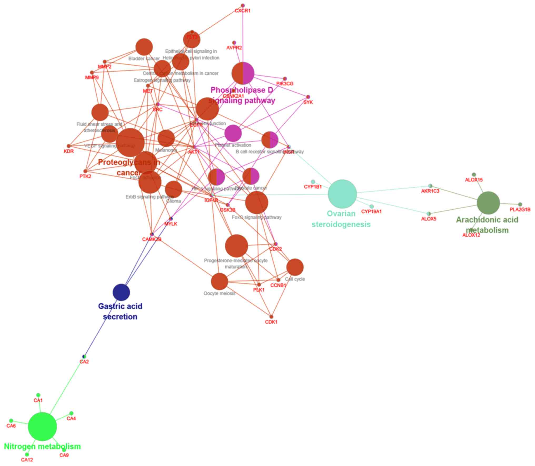 By using network pharmacology to predict disease targets, 66 target genes were identified, including MMP family, ALOX family, CA family, and PI3K, which are most likely potential targets for quercetin to protect articular cartilage. GO was used to analyze and process relevant data, and it was found that the predicted targets were involved in a number of body regulation, such as active oxygen metabolism, injury response regulation, vitamin metabolism, NO metabolism process, body aging, cell movement regulation, cadmium response and other processes. The aging of the body decreases the tolerance of the articular cartilage, causing wear and tear, which leads to osteoarthritis pain. Studies have shown that reactive oxygen are associated with various diseases, including cancer, inflammation of various parts of the body and cardiovascular diseases (17,18). Nitric oxide (NO) plays an important role in osteochondral repair. Studies have found that nitric oxide synthase (NOS) inhibitors have a significant effect on inhibiting the release of NO from regenerating cartilage. When NOS activity is decreased, NOS inhibitor has obvious effect in improving the quality of cartilage regeneration (19,20). Vitamin metabolism has an inseparable association with bone diseases. Vitamin D can regulate the cell activity of osteoblasts and osteoclasts, Vitamin A can inhibit osteoblast function, and Vitamin K can inhibit bone resorption activation factors (IL-1 and IL-6), and lower osteoclast activity, bone loss, and the risk of osteoarthritis (21). Furthermore, low concentrations of vitamin B may also be a trigger for bone mass reduction (22,23). The reaction process of cadmium can enhance the activity of osteoclasts, and bones are in the list of important target organs damaged by cadmium. Therefore, osteoclasts may be the target cells for bone diseases caused by changes in cadmium (24-26). Cadmium interferes bone metabolism, and its mechanism is associated with the effect on bone formation and absorption.
