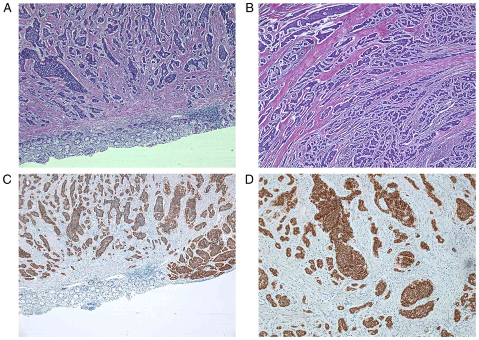 The patient was transferred to the 2nd Surgery Department of the ‘Sf. Spiridon’ Emergency Clinical Hospital, Iasi, Romania, where right hemicolectomy with ileotransverse anastomosis was performed. The biopsy examination from the resected tumor fragment was classified according to the World Health Organization Classification and Suggested Grading of Neuroendocrine Neoplasms of the Digestive System classification-NET G2 (Fig. 6) (1). Microscopically, the tumor cells had round or oval nuclei with ‘salt and pepper’ chromatin and eosinophilic granular cytoplasm. The tumor nests were arranged in trabecular, insular, or sheet-like patterns. Glandular-like structures or palisading of the peripheral cell layers were occasionally evident (1).