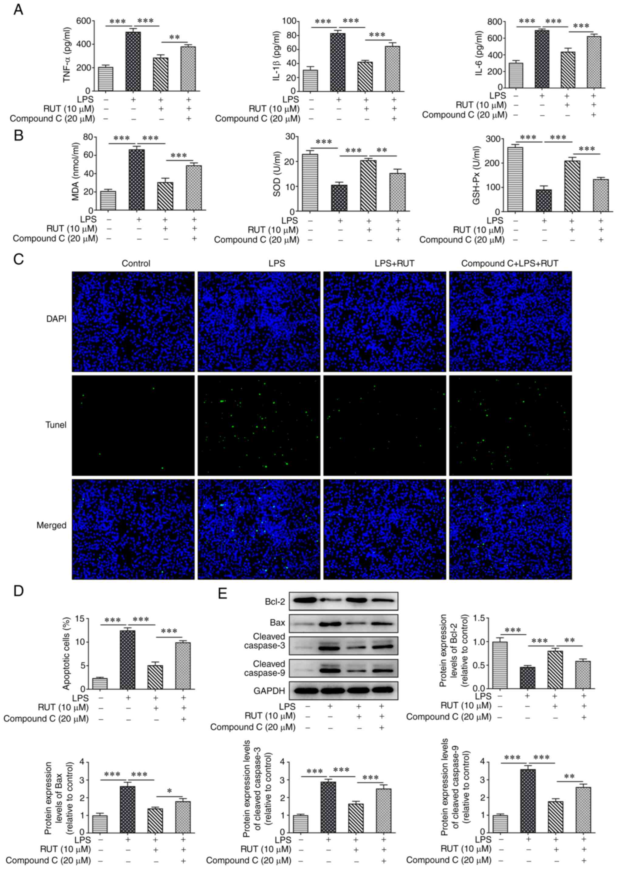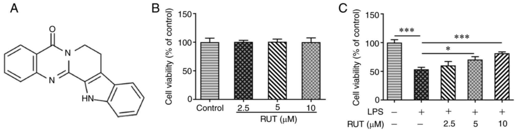 BEAS-2B human bronchial epithelial cells were obtained from American Type Culture Collection, and were cultured in DMEM containing 10% FBS (both from Thermo Fisher Scientific, Inc.), 100 U/ml penicillin and 100 µg/ml streptomycin (MilliporeSigma) in a humidified atmosphere containing 5% CO2 at 37˚C. Subsequently, the cells were pretreated with RUT (2.5, 5 and 10 µM; MedChemExpress) for 24 h at 37˚C (9,12) and then incubated with LPS (2 µg/ml; Sigma-Aldrich; Merck KGaA) at 37˚C for a further 24 h. In addition, compound C (20 µM; Sigma-Aldrich, Merck KGaA) was used as an inhibitor of the AMPK signaling pathway to treat cells prior to LPS or RUT treatment for 24 h at 37˚C.