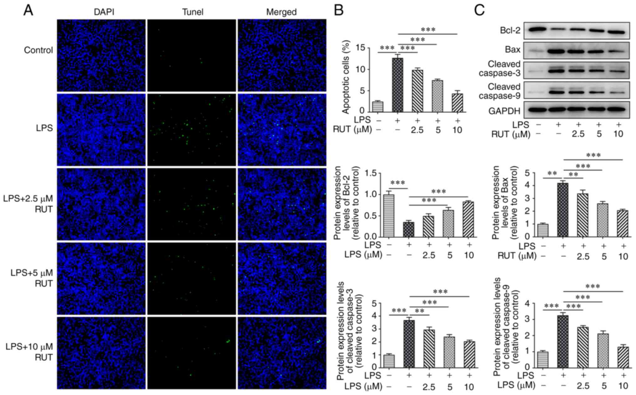 The effects of RUT on the inflammatory response, oxidative stress and apoptosis in BEAS-2B cells induced by LPS were further investigated. As shown in Fig. 2A, a notable increase in the production of TNF-α, IL-1β and IL-6 was observed in LPS-induced cells compared with in the control cells. However, RUT treatment reduced the LPS-induced elevated levels of TNF-α, IL-1β and IL-6 in BEAS-2B cells. Furthermore, LPS enhanced the MDA levels, but inhibited the activities of SOD and GSH-Px, whereas RUT reversed the effects of LPS on MDA, SOD and GSH-Px, indicating the suppressive effect of RUT on oxidative stress in LPS-induced BEAS-2B cells (Fig. 2B). Furthermore, the cell apoptotic rate was significantly increased in the LPS group compared with in the control group, and RUT pretreatment suppressed cell apoptosis under LPS stimulation in a dose-dependent manner (Fig. 3A and B). Western blot analysis further demonstrated that the protein expression levels of Bcl-2 were decreased, whereas the protein expression levels of Bax, cleaved caspase-3 and cleaved caspase-9 were markedly increased in BEAS-2B cells following stimulation with LPS, whereas the opposite trends in the expression levels of these proteins were observed following pretreatment with RUT (Fig. 3C). These data suggested that RUT pretreatment suppressed the LPS-induced inflammation, oxidative stress and apoptosis of BEAS-2B cells.