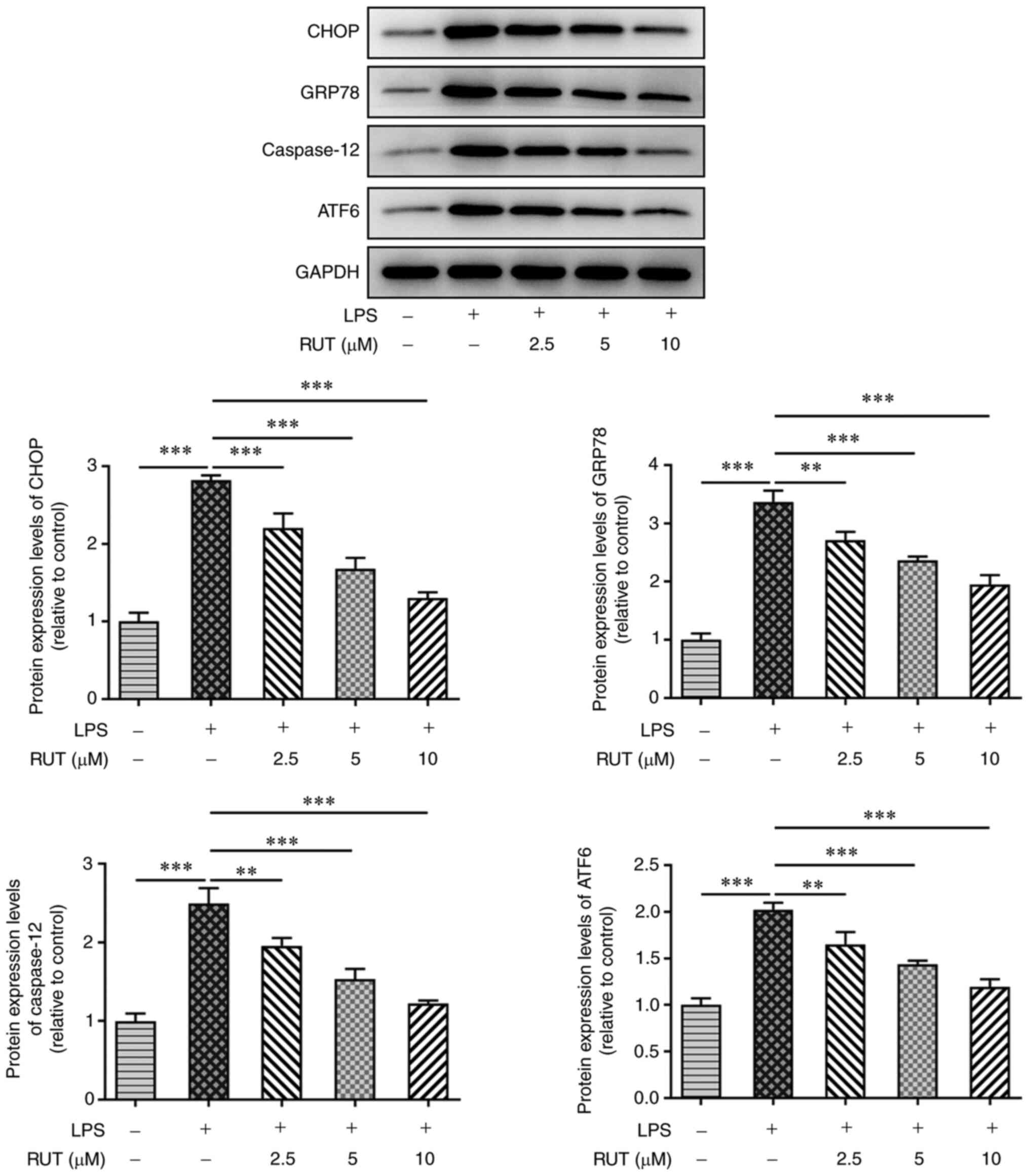 The present study explored the potential mechanisms underlying the protective effects of RUT on LPS-exposed BEAS-2B cells. As shown in Fig. 4, western blot analysis revealed that LPS significantly promoted the expression levels of ER stress-related proteins, including CHOP, GRP78, caspase-12 and ATF6. However, the expression levels of these proteins were dose-dependently reduced by treatment with different concentrations of RUT. These results indicated that RUT pretreatment had an inhibitory effect on LPS-induced ER stress in BEAS-2B cells.
