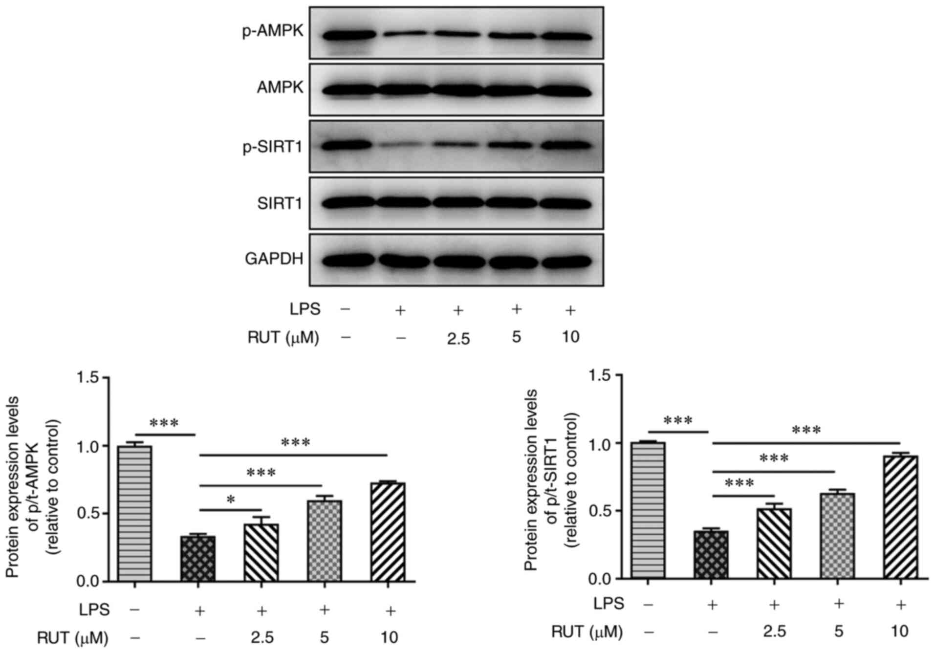 To investigate the molecular mechanism underlying the effects of RUT on LPS-treated cells, the expression levels of proteins involved in the AMPK/SIRT1 signaling pathway were detected by western blotting. As shown in Fig. 5, LPS stimulation markedly inhibited the phosphorylation of AMPK and SIRT1; however, different doses of RUT dose-dependently increased the protein expression levels of p-AMPK and p-SIRT1. Additionally, the total protein levels of both AMPK and SIRT1 were not significantly different among the groups. These results indicated that RUT may activate the AMPK/SIRT1 signaling pathway in ALI.