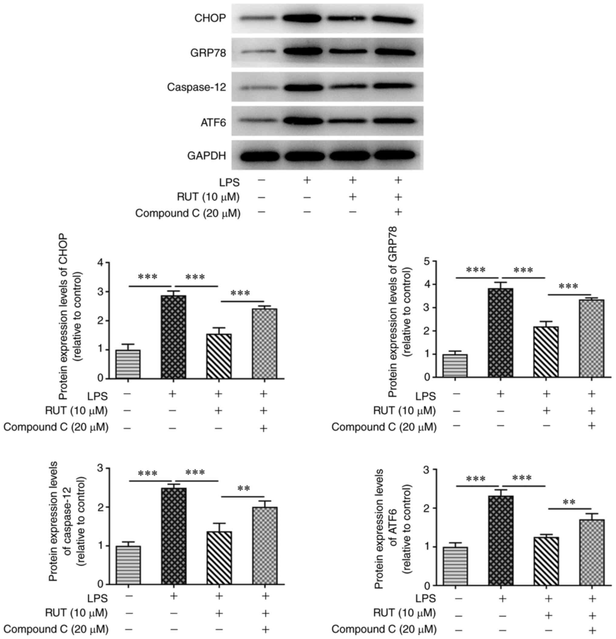 To identify the role of AMPK/SIRT1 signaling in RUT-treated BEAS-2B cells, the AMPK inhibitor compound C was used. As shown in Fig. 6A, pretreatment with compound C (20 µM) markedly enhanced the levels of TNF-α, IL-1β and IL-6 in BEAS-2B cells co-treated with RUT and LPS. In addition, compound C increased the levels of MDA, and reduced the activities of SOD and GSH-Px compared with those in the RUT + LPS group (Fig. 6B). Additionally, the decreased percentage of apoptotic cells was enhanced by compound C, and the protein expression levels of Bcl-2, Bax, cleaved caspase-3 and cleaved caspase-9 were reversed by compound C in BEAS-2B cells co-treated with RUT and LPS (Fig. 6C-E). Furthermore, compound C markedly exacerbated the ER stress process by increasing the expression levels of CHOP, GRP78, caspase-12 and ATF6 in BEAS-2B cells co-treated by RUT and LPS (Fig. 7). These data suggested that RUT suppressed LPS-induced cell injury and ER stress via activation of the AMPK/SIRT1 signaling pathway in BEAS-2B cells.