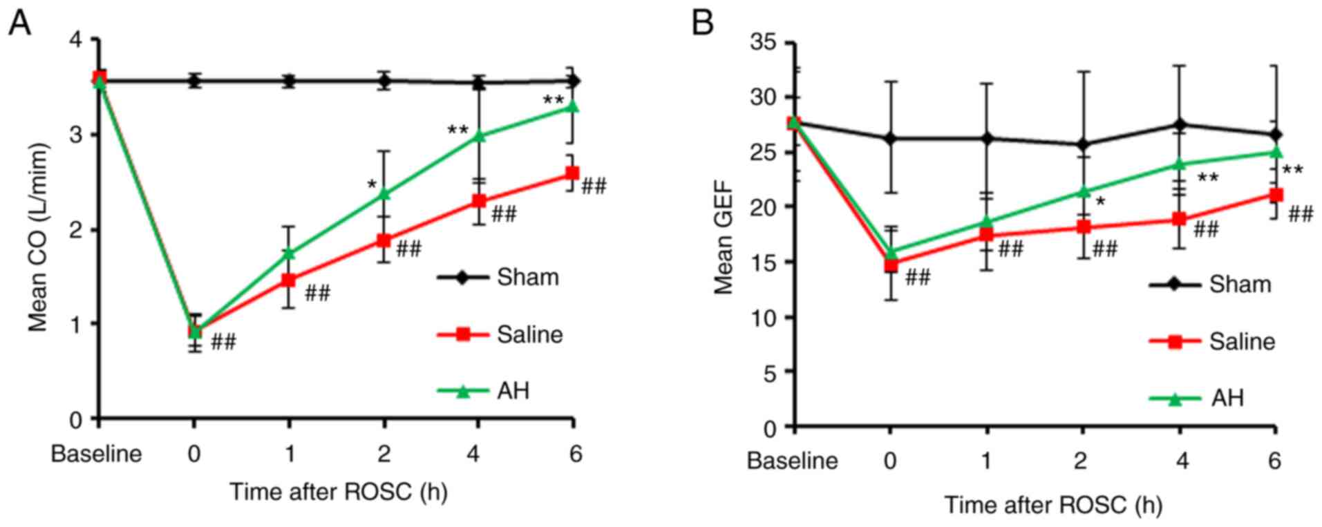 Restoration of spontaneous circulation (ROSC) was defined by the systolic blood pressure >50 mm Hg for more than 10 min. If spontaneous circulation was not restored within 30 min, the pig was considered dead (18). Immediately after successful CPR, pigs were randomly divided into 2 groups (n=8): Saline and AH. Saline or AH (4 mg/kg) was administered via central venous injection. The same procedures without VF initiation were conducted in the Sham group. At the end of the study, pigs were euthanized with an overdose of pentobarbital (150 mg/kg) via the femoral artery.