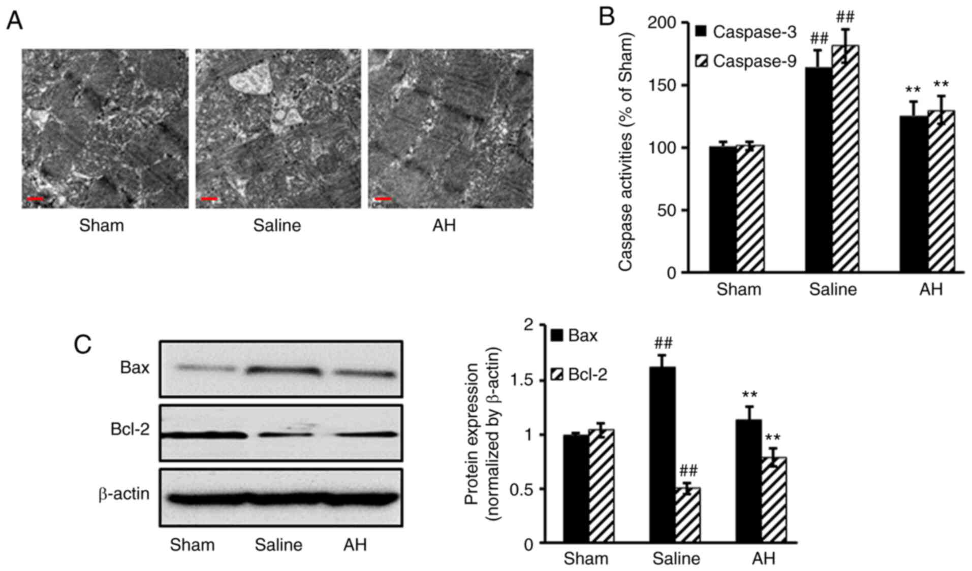 After treatment, hearts were harvested for histopathological analysis. Obvious pathological changes were observed in the saline group. However, myocardial tissue damage was markedly ameliorated after AH treatment. AH treatment significantly decreased the activities of caspase 3/9 compared with the saline group. Moreover, Pro-apoptotic protein Bax expression decreased, but anti-apoptotic protein Bcl-2 increased after AH treatment compared with the saline group (Fig. 2).