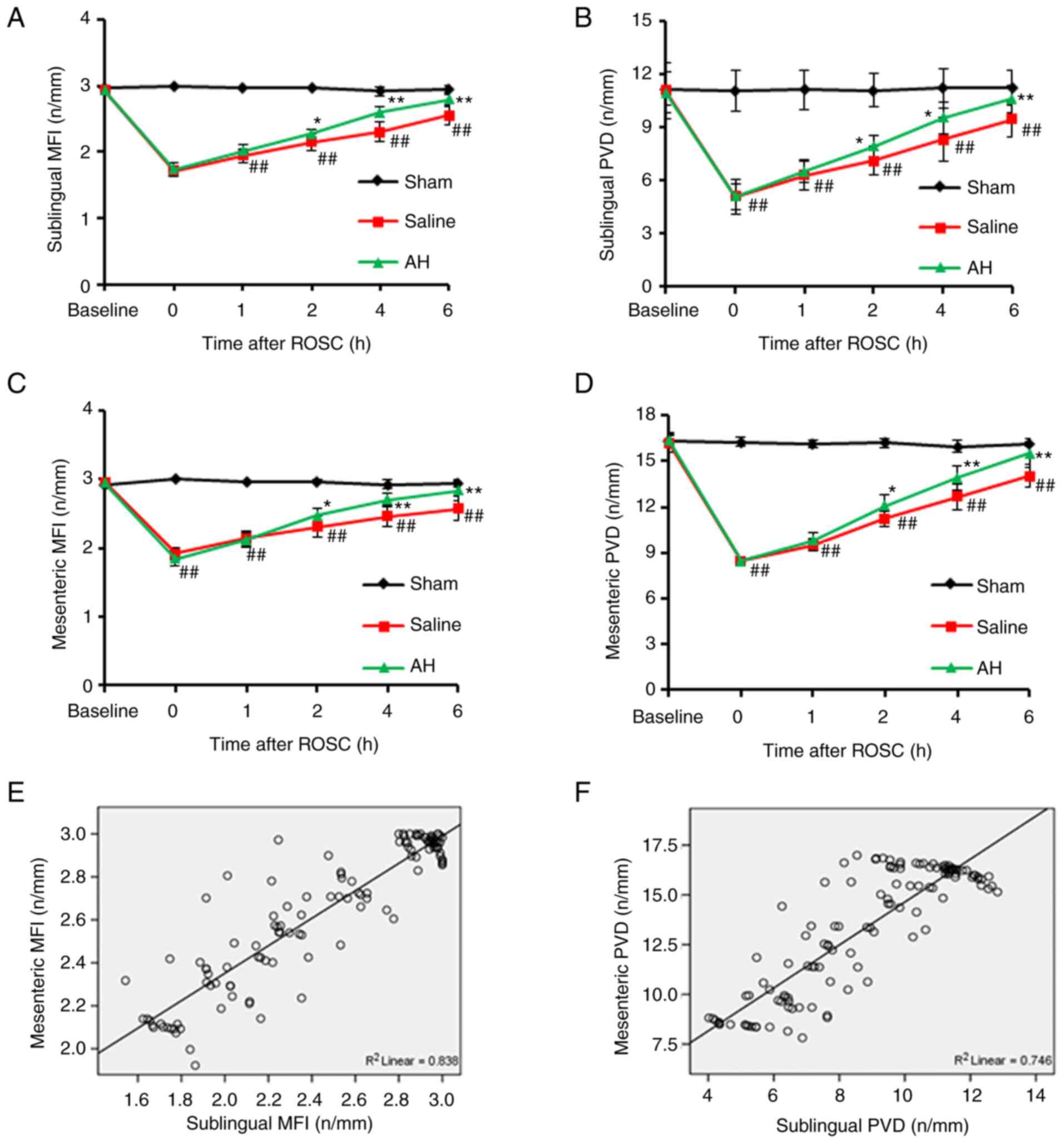 After resuscitation, PVD and MFI decreased significantly in the intestines and the sublingual region compared with the Sham group. Afterwards, PVD and MFI gradually recovered with time. However, these microcirculatory indexes recovered faster in the AH group than the Saline group. At 2, 4 and 6 h after resuscitation, there were significant differences of PVD and MFI in both intestines and the sublingual region between two groups. Moreover, the microcirculatory indexes (PVD and MFI) had a strong correlation between the intestines and the sublingual regions (Figs. 3 and 4).