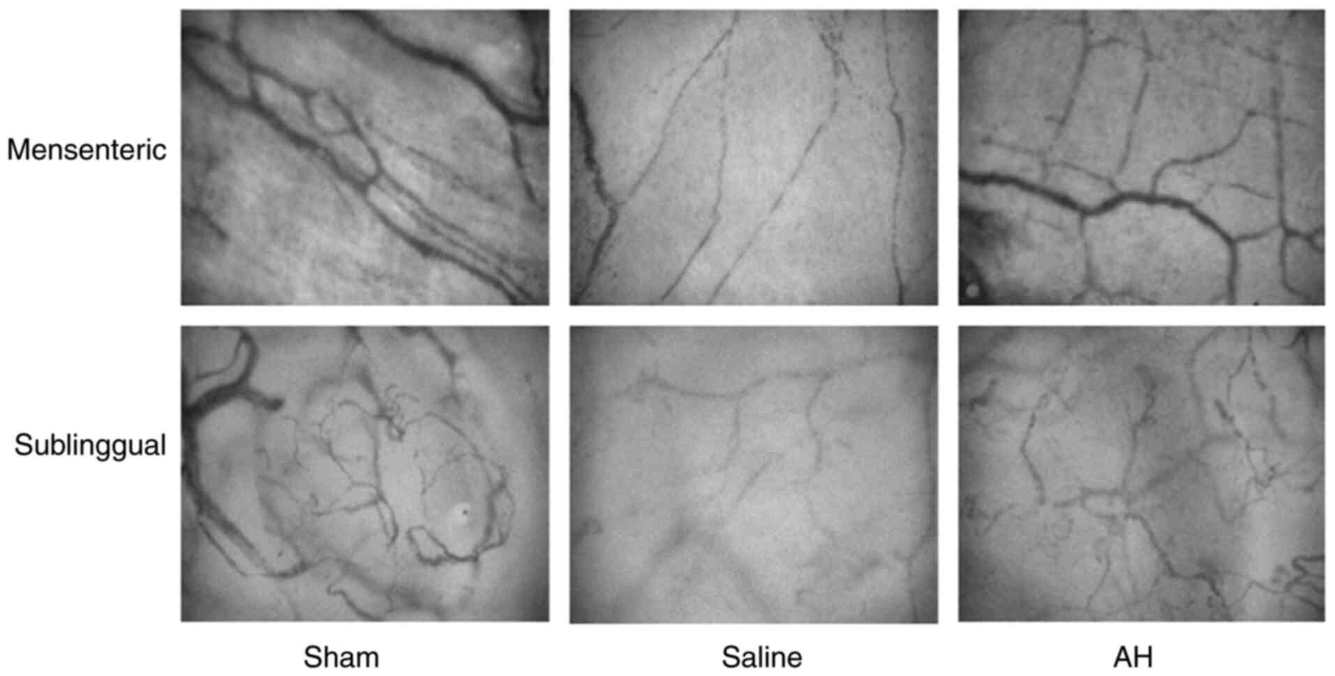 In terms of both systemic and local factors could make contribution to the intestinal microcirculation, including but not limited to inflammatory cytokines and vasomotor function. In the present study, the parameters of sublingual and intestinal microcirculation and the hemodynamic parameters indicated that the cardiac function of animals was improved in the AH group compared with the Saline group, suggesting that AH can help improve the microcirculation and the cardiac function, and has protective effects after resuscitation.