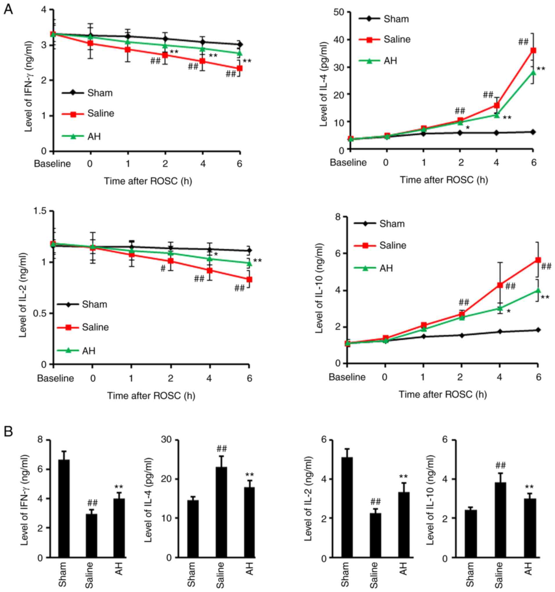 IL-2, IL-4, IL-10 and IFN-γ levels were determined in serum and heart tissue lysate. The results showed that IL-4 and IL-10 secretion significantly increased after ROSC, but IFN-γ and IL-2 levels significantly decreased. However, AH treatment significantly decreased the IL-4 as well as IL-10 levels and increased the IFN-γ as well as the IL-2 levels (Fig. 5). These data indicated that ROSC promoted Th1 to Th2 transformation, but was largely inhibited by AH treatment.