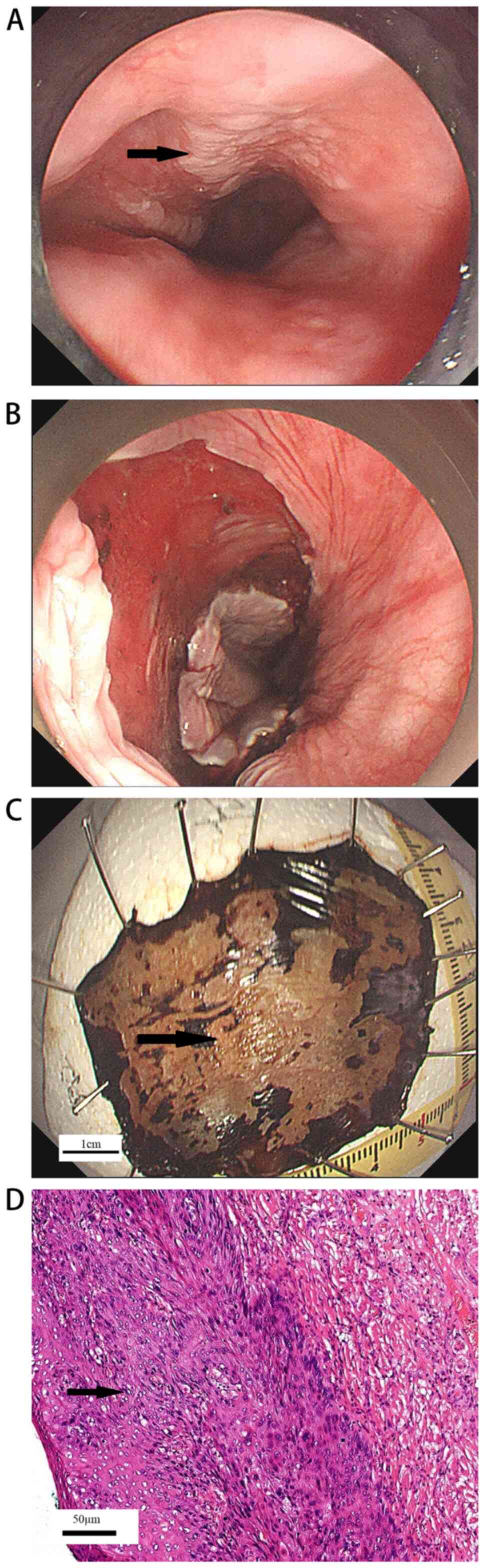 Esophageal cancer is a common type digestive system malignancy and currently ranks sixth in terms of the rate of cancer-associated mortality worldwide (1). Despite progress in the development of novel treatment strategies, the 5-year survival rate of esophageal cancer remains <20% (2). Esophageal cancer in the early stages is confined to the mucosa or superficial submucosa and accounts ~20% of all types of esophageal cancers (3). Surgical resection has long been the standard treatment method for early esophageal cancer (4). However, the high incidence of complications (such as gastroesophageal reflux and respiratory failure) as a result of this technique renders it unattractive, due to its severe negative effects on the quality of life of patients (4). Nevertheless, the development of gastroscopy has greatly improved the quality of life of patients with early esophageal cancer.
