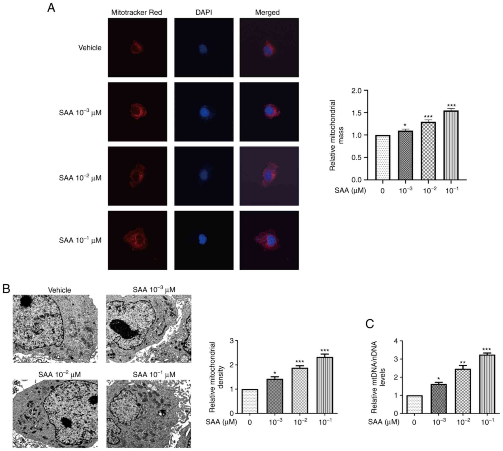 To assess the effects of SAA on mitochondrial biogenesis, Mitotracker red staining was used to detect the mitochondrial mass of HUVECs. SAA treatment significantly increased the mitochondrial mass in a dose-dependent manner compared with cells treated with vehicle only (Fig. 1A). The number of mitochondria was also observed using electron microscopy. Compared with the vehicle group, the number of mitochondria in the SAA group significantly increased in a dose-dependent manner, with the highest number of mitochondria in cells treated with 10-1 µM SAA (Fig. 1B). Increased copy number of mtDNA indicated mitochondrial biogenesis (Fig. 1C). The mtDNA levels were increased by 1.8, 2.4, and 3.2 times with SAA treatment at 10-3, 10-2 and 10-1 µM, respectively. These results indicated that SAA treatment significantly increased mtDNA levels in HUVECs compared with the vehicle-only group. The results suggested that SAA promotes mitochondrial biogenesis.