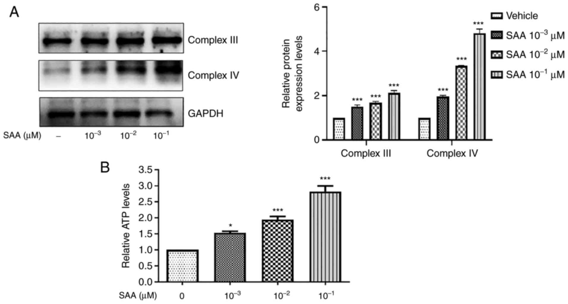 The ATP levels of cells were determined via a colorimetric method using an ATP test kit (Elabscience Biotechnology, Inc.). Creatine kinase catalyzes the reaction of creatine and ATP to generate creatine phosphate; creatine phosphate content is detected using a colorimetric method to reflect the ATP content (18). The cells were cultured in 6-well plates in 37˚C humidified with 5% CO2 until adherent. Following adherence, the cells were treated with different concentrations of SAA (10-3, 10-2 and 10-1 µM) and incubated at 37˚C for 24 h. The collected cells were added with 0.3 ml boiling deionized water for each 106 cells, tightly covered and mixed, then inserted into the floating float and placed in the boiling water bath for 10 min, then mixed in vortex for 1 min at room temperature of 1,000 x g and centrifuged for 10 min. The ATP levels of the supernatant were assessed according to the instructions provided by the manufacturer. The optical density was measured at 636 nm using a microplate reader and the ATP levels were determined using the manufacturer's formula.