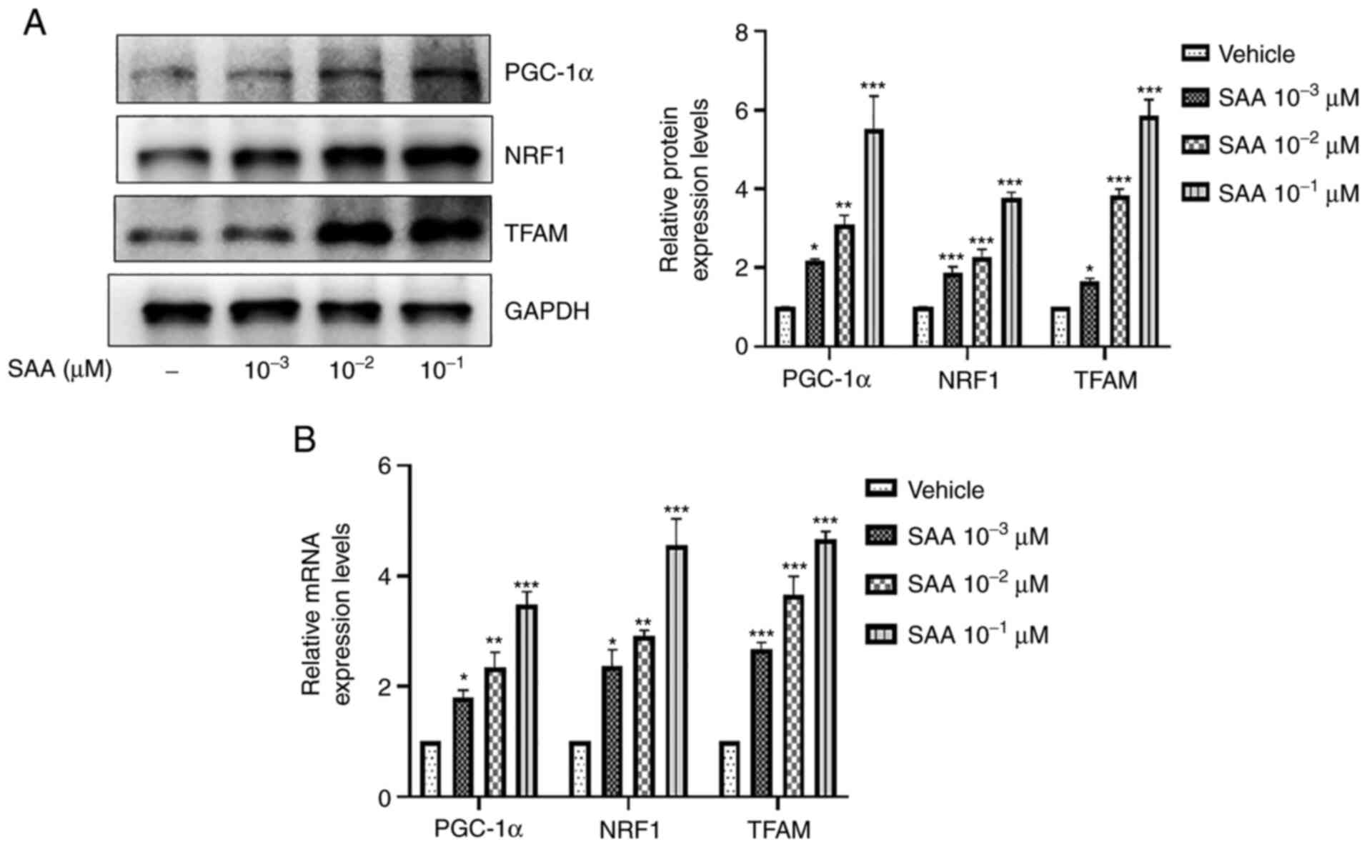 It has previously been reported that mitochondrial biogenesis is associated with the PGC-1α/NRF1/TFAM signaling pathway (20). It was therefore hypothesized that the promotion of mitochondrial biogenesis by SAA may also be related to the PGC-1α/NRF1/TFAM signaling pathway. Therefore, the effect of SAA on the mRNA and protein expression levels of PGC-1α, NRF1 and TFAM in HUVECs was investigated. The results indicated that the mRNA and protein expression levels of PGC-1α, NRF1 and TFAM were all significantly increased following the treatment of HUVECs with SAA at concentrations of 10-3, 10-2 and 10-1 µM compared with the vehicle group (Fig. 3). These results suggested that SAA increased the expression of PGC-1 α, NRF1, TFAM, which are associated with mitochondrial biogenesis.