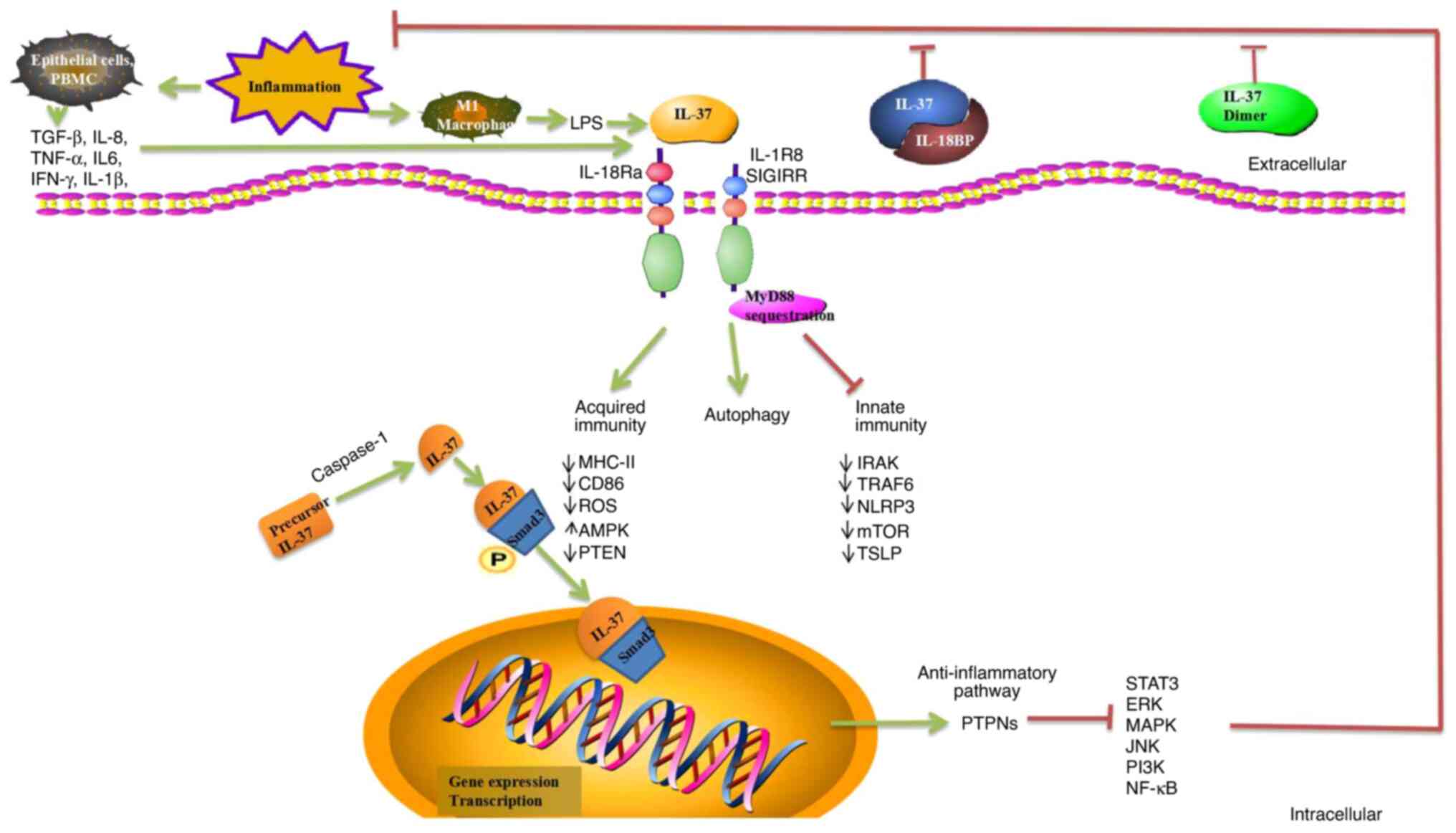IL-37 primarily reduces innate and acquired immune responses through intracellular and extracellular inhibition by reducing the secretion of pro-inflammatory chemokines (11,27). IL-37 is a transcription factor that can be used to regulate gene expression in cells. Caspase-1 cooperates with the signal transduction protein Smad3 to regulate its transcription (17).