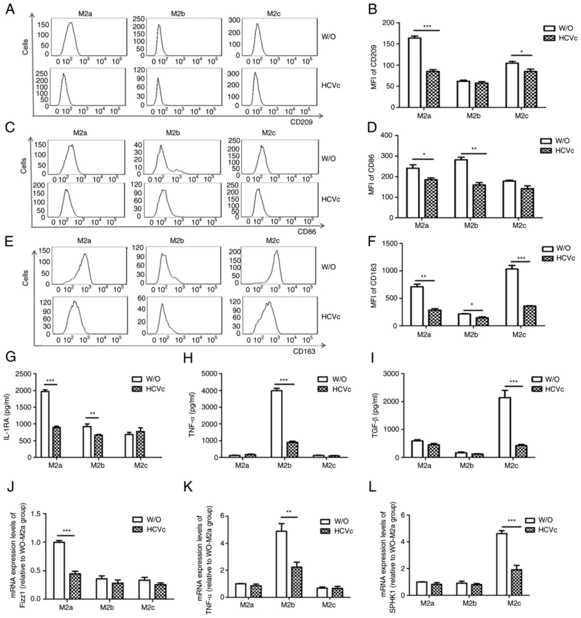 According to our previous study, HCVc can inhibit the polarization of monocytes towards M1 and M2 macrophages (16). The present study investigated whether the impaired polarization of the three types of M2 macrophages in patients with CHC was also affected by HCVc. Therefore, purified monocytes derived from the healthy people were polarized to M2a, M2b and M2c macrophages in the presence or absence of HCVc to study the effect of HCVc on M2 macrophages polarization in vitro. The optimal HCVc concentration was chosen according to the results of previous studies (16,22); 10 µg/ml was used as the standard concentration in all experiments. The results of the present study demonstrated that HCVc downregulated the expression levels of CD209, CD86 and CD163 (P<0.05; Fig. 2A-F) on M2a macrophages, as well as the release of IL-1RA (P<0.05; Fig. 2G) and the mRNA expression levels of Fizz1 (P<0.05; Fig. 2J), compared with W/O group. HCVc also downregulated the expression levels of CD86 (P<0.05; Fig. 2C and D) on M2b macrophages, as well as the release of IL-1RA and TNF-α (P<0.05; Fig. 2G and H) and the mRNA expression levels of TNF-α (P<0.05; Fig. 2K), compared with the medium controls. In addition, HCVc downregulated the expression levels of CD209 and CD163 (P<0.05; Fig. 2A, B, E and F) on M2c macrophages, as well as the release of TGF-β (P<0.05; Fig. 2I) and the mRNA expression levels of SPHK1 (P<0.05; Fig. 2L), compared with the medium controls. The present results demonstrated that HCVc inhibited all the three types of M2 macrophage polarization, which is in accordance with chronic HCV infection.