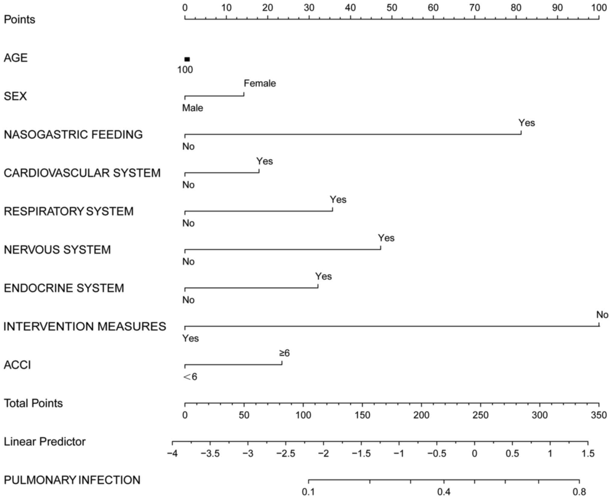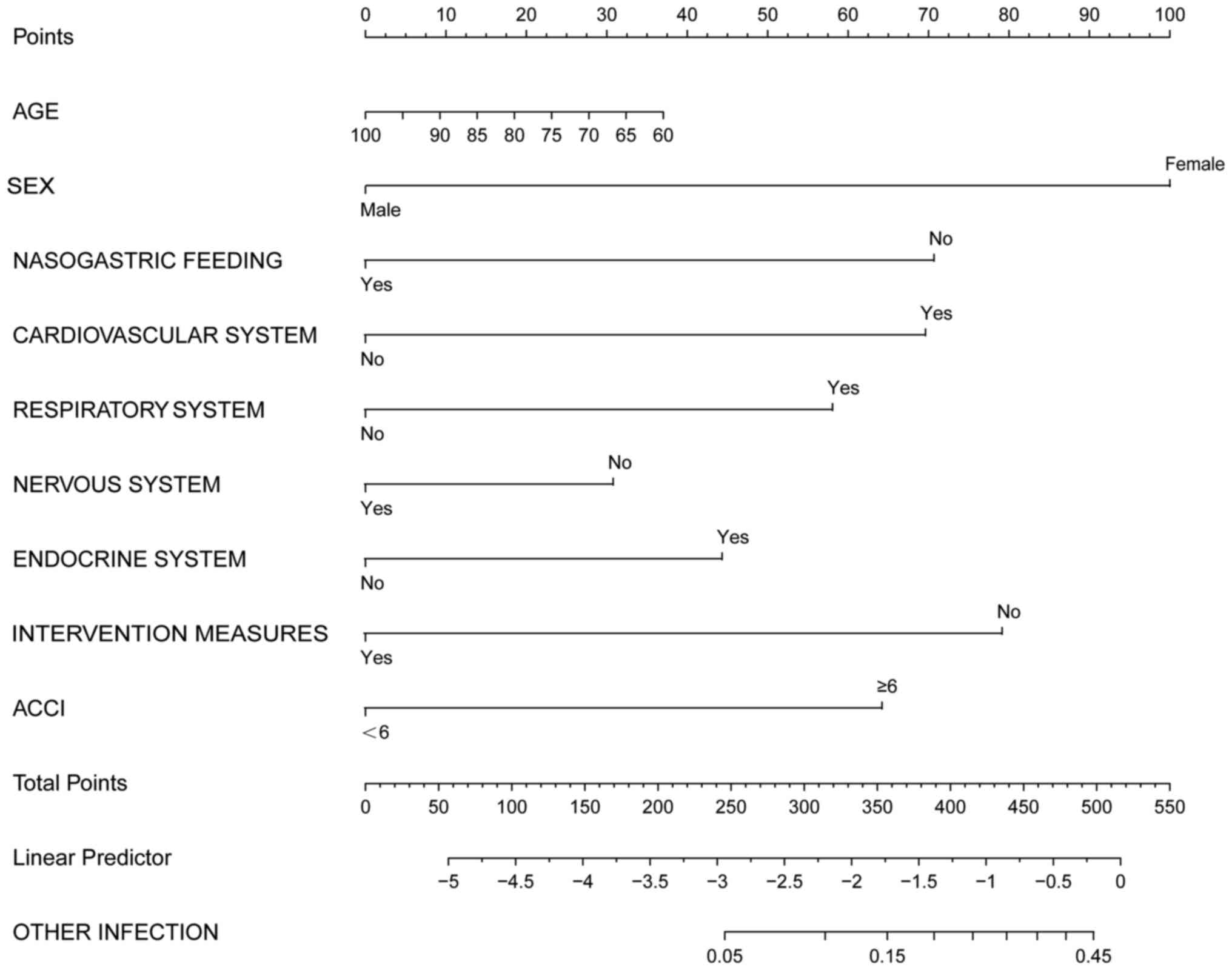 In all patients with infection, a total score was calculated based on age, sex, nasogastric feeding, diseases of the cardiovascular, respiratory, nervous and endocrine systems, aCCI and intervention measures. However, the application of this model is relatively complex, therefore it has not been widely applied clinically. Further simplification is required.
